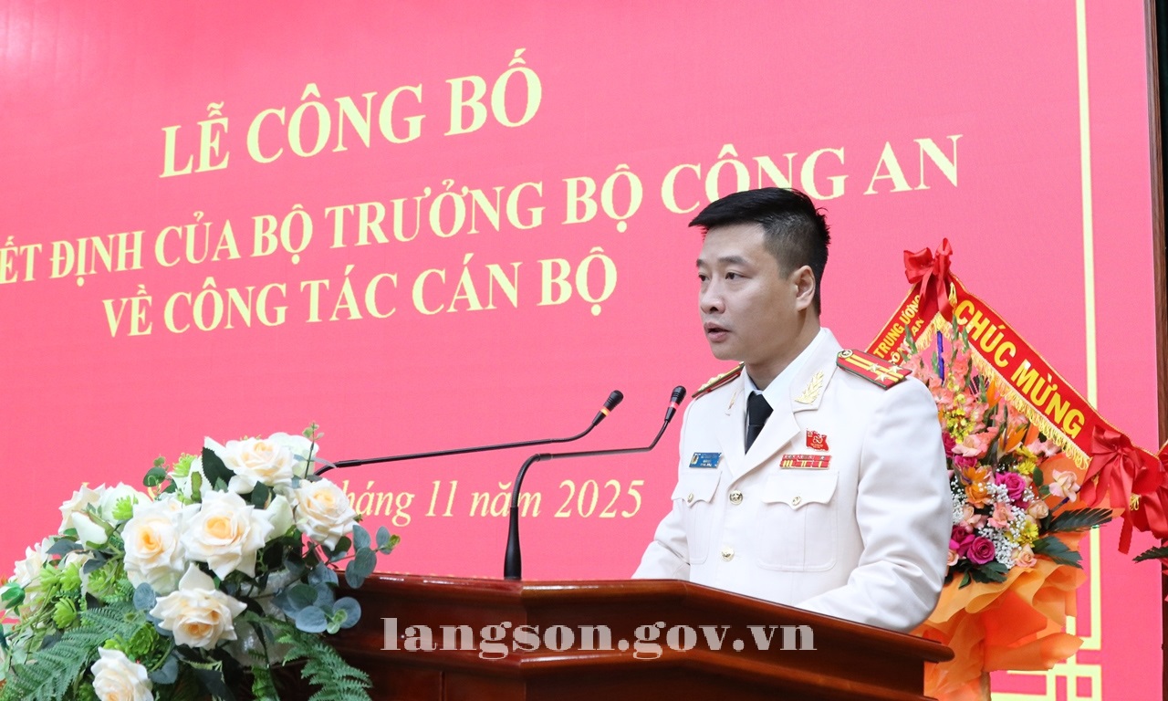 Công bố Quyết định số 9689/QĐ-BCA ngày 18/11/2025 của Bộ trưởng Bộ Công an về việc điều động và bổ nhiệm đồng chí Thượng tá Vũ Thanh Tùng, Phó Cục trưởng Cục Cảnh sát điều tra tội phạm về tham nhũng, kinh tế, buôn lậu, Bộ Công an đến nhận công tác và giữ chức vụ Giám đốc Công an tỉnh Lạng Sơn, từ ngày 21/11/2025.