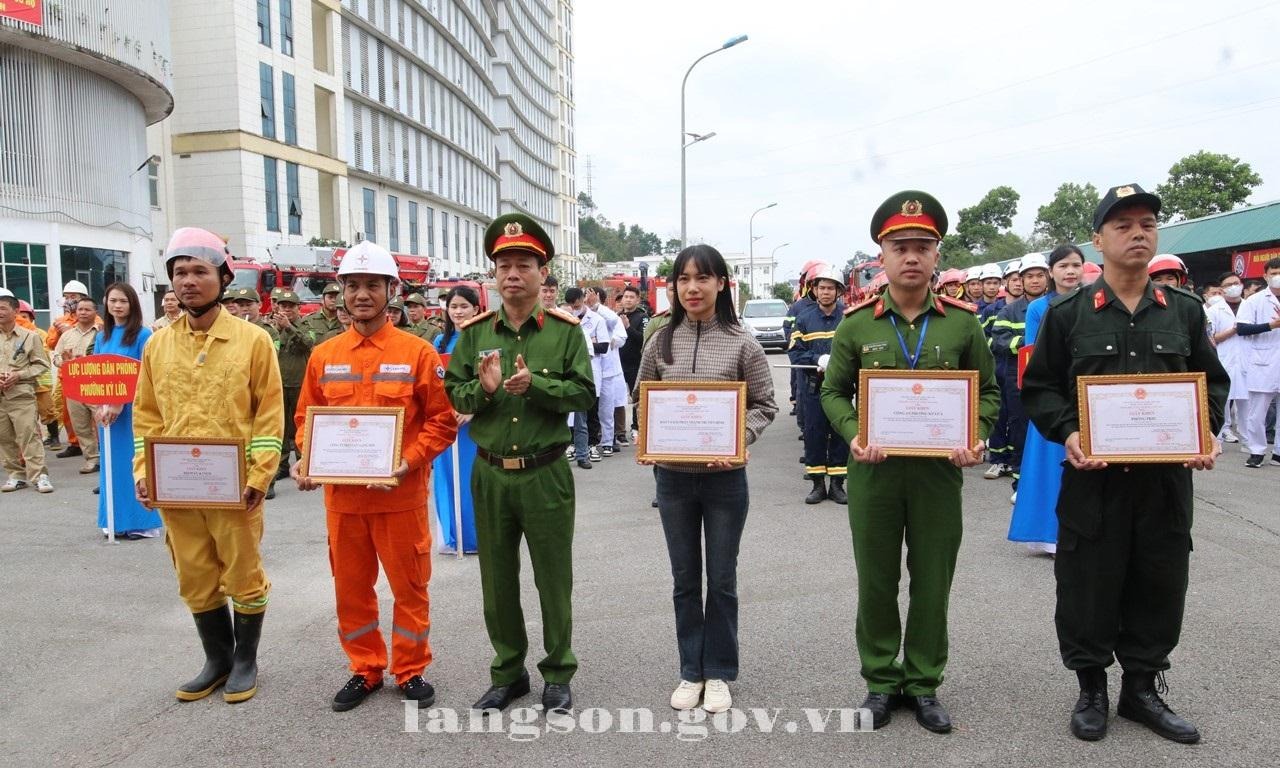 Nhân dịp này, Ban Tổ chức đã báo cáo, đề xuất Chủ tịch UBND tỉnh tặng bằng khen cho 03 tập thể, 03 cá nhân; Giám đốc Công an tỉnh tặng giấy khen cho 05 tập thể, 13 cá nhân có thành tích xuất sắc, đột xuất trong tổ chức thực tập phương án chữa cháy và CNCH.