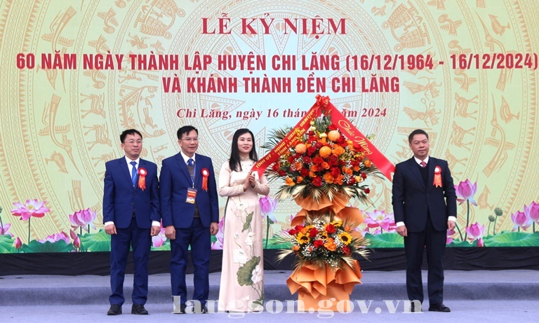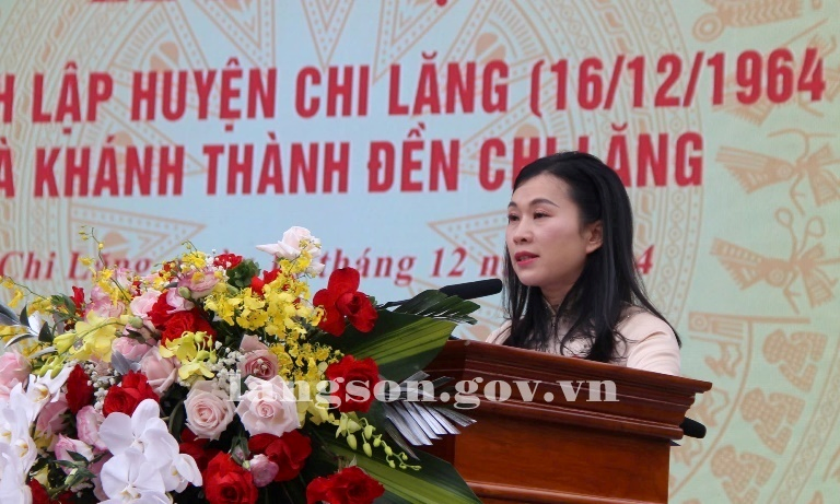 Phát biểu tại buổi lễ, đồng chí Đoàn Thanh Sơn, Phó Chủ tịch UBND tỉnh biểu dương, chúc mừng những kết quả Đảng bộ, chính quyền và Nhân dân huyện Chi Lăng đạt được trong thời gian qua. Về nhiệm vụ thời gian tới, đồng chí đề nghị cấp ủy, chính quyền huyện tiếp tục tăng cường kỷ cương, kỷ luật, xây dựng nền hành chính hiện đại, năng động, hiệu lực, hiệu quả, tiếp tục cải thiện môi trường kinh doanh, tạo điều kiện thuận lợi tối đa hỗ trợ, phục vụ người dân, doanh nghiệp; phát huy sức mạnh tổng hợp, huy động mọi nguồn lực khai thác, sử dụng hiệu quả các tiềm năng, thế mạnh của huyện, nhất là hoàn thiện hệ thống kết cấu hạ tầng giao thông, đô thị, tập trung phát triển các thế mạnh nông, lâm nghiệp, xây dựng các sản phẩm du lịch đặc sắc của địa phương; quan tâm phát triển văn hóa, xã hội, đảm bảo an sinh xã hội, chú trọng phát triển giáo dục đào tạo, khoa học, công nghệ, y tế, nâng cao sức khỏe người dân, bảo tồn và phát huy bản sắc văn hóa truyền thống, di tích lịch sử.