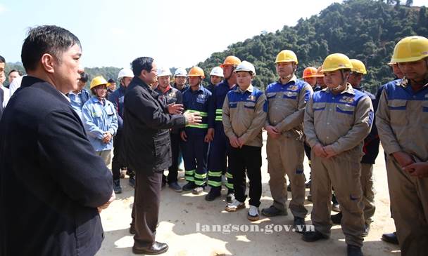 Thủ tướng động viên công nhân thi công tại nút giao IC-07 dự án cao tốc Hữu Nghị-Chi Lăng
