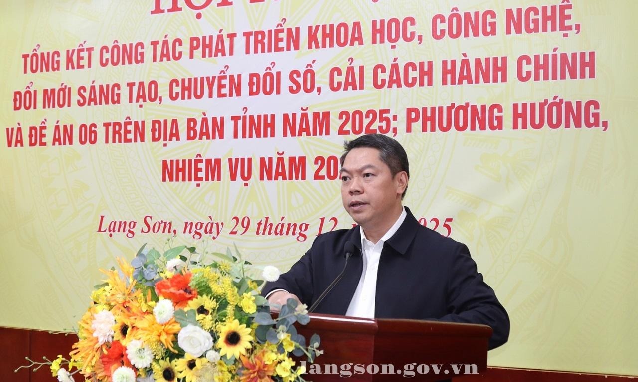 Theo báo cáo tại hội nghị, trong năm 2025, công tác phát triển khoa học, công nghệ, đổi mới sáng tạo, chuyển đổi số và Đề án 06 trên địa bàn tỉnh đạt nhiều kết quả nổi bật, tạo chuyển biến rõ nét trong hoạt động của hệ thống chính trị. Việc triển khai thực hiện Nghị quyết số 57-NQ/TW ngày 22/12/2024 của Bộ Chính trị về đột phá phát triển khoa học, công nghệ, đổi mới sáng tạo và chuyển đổi số trên địa bàn tỉnh được tổ chức triển khai đồng bộ, quyết liệt, có trọng tâm, trọng điểm. Tỉnh Lạng Sơn là 01 trong 02 tỉnh hoàn thành sớm nhất toàn bộ nhiệm vụ giai đoạn 1, đồng thời là 01 trong 03 tỉnh hoàn thành sớm nhất các nhiệm vụ được giao tại Kế hoạch số 02-KH/BCĐTW của Ban Chỉ đạo Trung ương về thúc đẩy chuyển đổi số. UBND tỉnh được giao 148 nhiệm vụ theo Nghị quyết số 71/NQ-CP của Chính phủ, Kế hoạch số 02-KH/BCĐTW và các Thông báo kết luận của Ban Chỉ đạo Trung ương. Đến thời điểm báo cáo, tỉnh đã hoàn thành 144/148 nhiệm vụ (đạt 97,3%); 04 nhiệm vụ còn lại đang triển khai đúng tiến độ, còn thời hạn thực hiện đến năm 2026, 2028.
