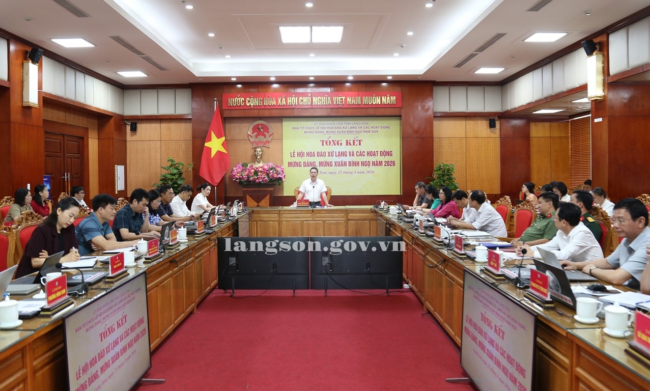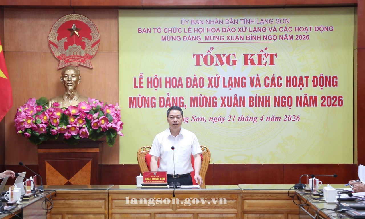 Ngày 21/4/2026, đồng chí Đoàn Thanh Sơn, Phó Chủ tịch UBND tỉnh, Trưởng Ban Tổ chức (BTC) Lễ hội Hoa Đào Xứ Lạng và các hoạt động mừng Đảng, mừng Xuân Bính Ngọ năm 2026 chủ trì cuộc họp tổng kết Lễ hội Hoa Đào Xứ Lạng và các hoạt động mừng Đảng, mừng Xuân Bính Ngọ năm 2026. Dự họp có lãnh đạo các sở, ban, ngành thành viên BTC, lãnh đạo một số xã, phường.