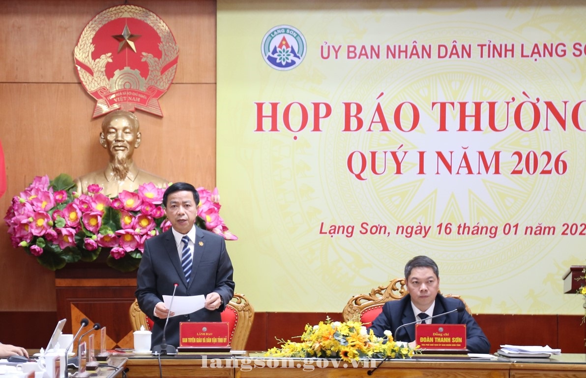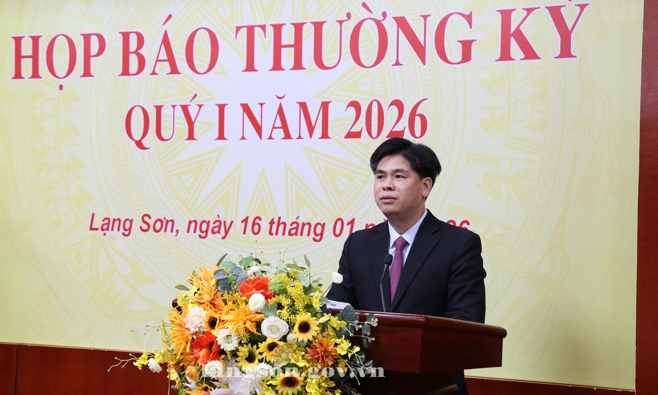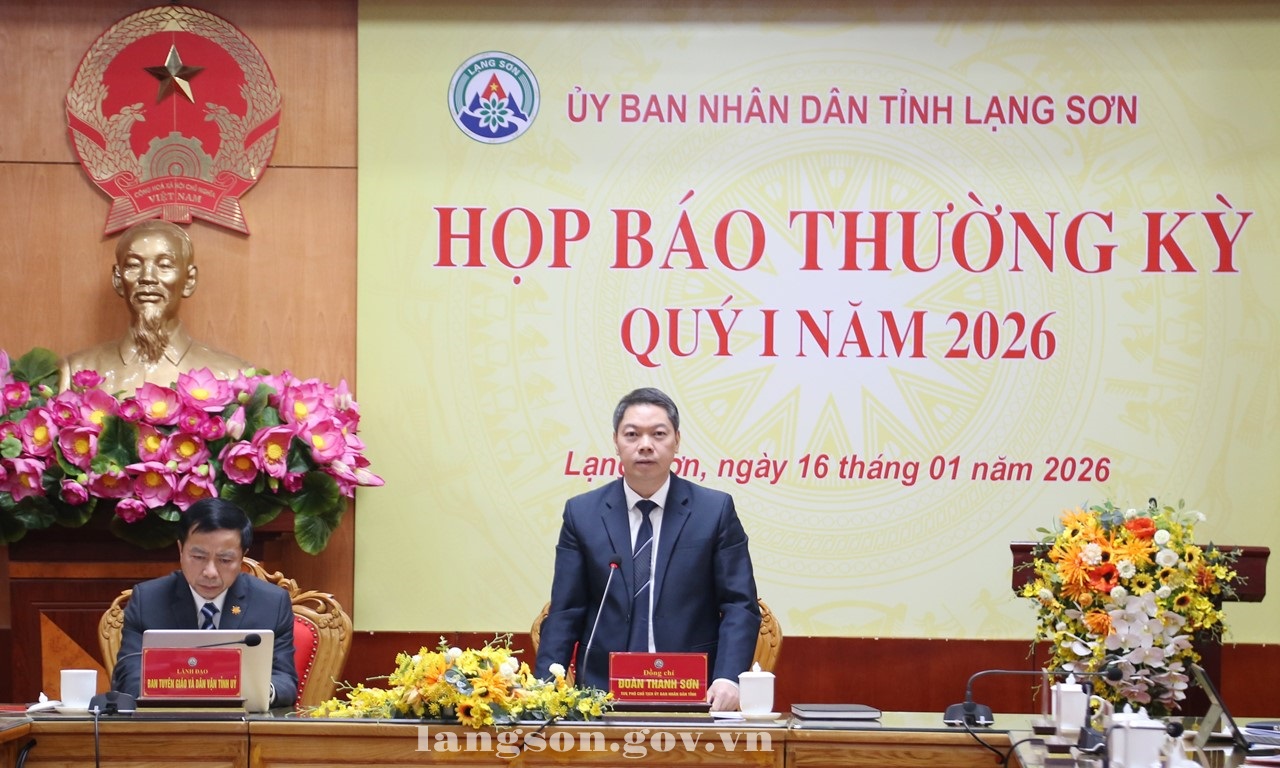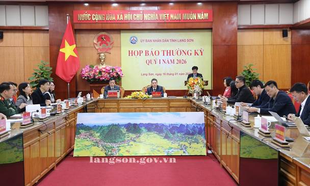 Sáng 16/01/2026, UBND tỉnh Lạng Sơn tổ chức họp báo thường kỳ quý I năm 2026 để thông tin về những kết quả nổi bật trong chỉ đạo, điều hành phát triển kinh tế - xã hội trên địa bàn tỉnh năm 2025; nhiệm vụ, giải pháp trọng tâm năm 2026; định hướng công tác tuyên truyền trong thời gian tới.