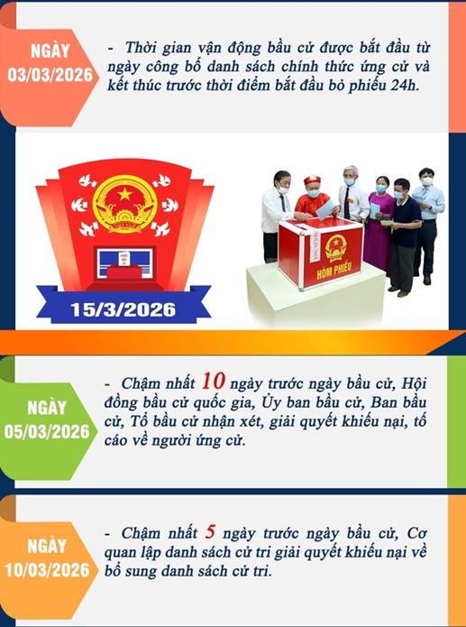 - Ngày 05/3/2026: Hội đồng bầu cử quốc gia, Ủy ban bầu cử, Ban bầu cử, Tổ bầu cử nhận xét, giải quyết khiếu nại, tố cáo về người ứng cử (chậm nhất 10 ngày - Điều 70 Luật Bầu cử đại biểu Quốc hội và đại biểu HĐND).