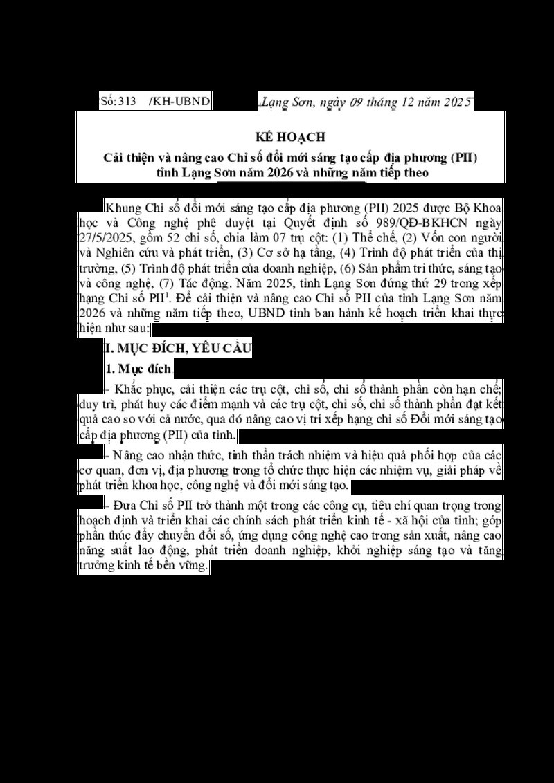 | Tiêu đề văn bản | KẾ HOẠCH Cải thiện và nâng cao Chỉ số đổi mới sáng tạo cấp địa phương (PII) tỉnh Lạng Sơn năm 2026 và những năm tiếp theo | ||