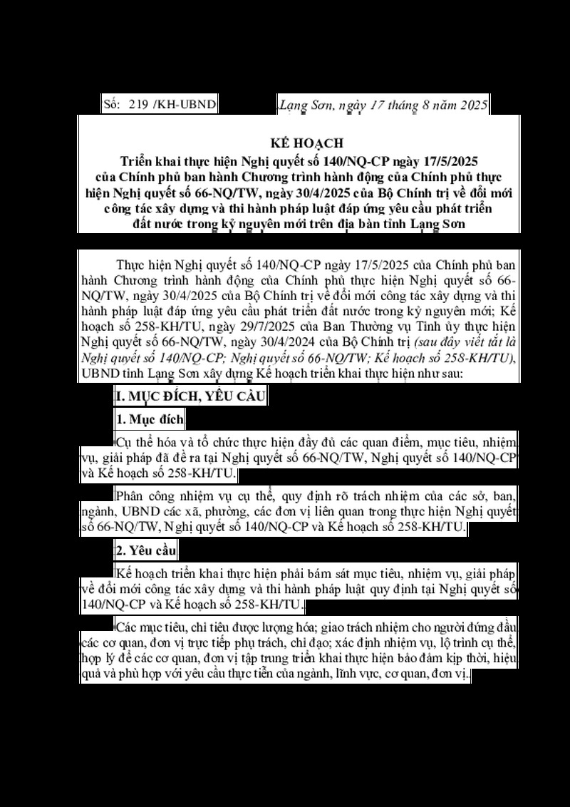 | Tiêu đề văn bản | KẾ HOẠCH Triển khai thực hiện Nghị quyết số 140/NQ-CP ngày 17/5/2025 của Chính phủ ban hành Chương trình hành động của Chính phủ thực hiện Nghị quyết số 66-NQ/TW, ngày 30/4/2025 của Bộ Chính trị về đổi mới công tác xây dựng và thi hành pháp luật đáp ứng yêu cầu phát triển đất nước trong kỷ nguyên mới trên địa bàn tỉnh Lạng Sơn | ||
