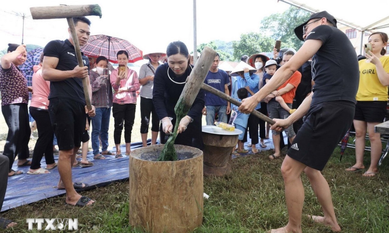 Du khách trải nghiệm dã, làm bánh ngải truyền thống. Ảnh TTXVN