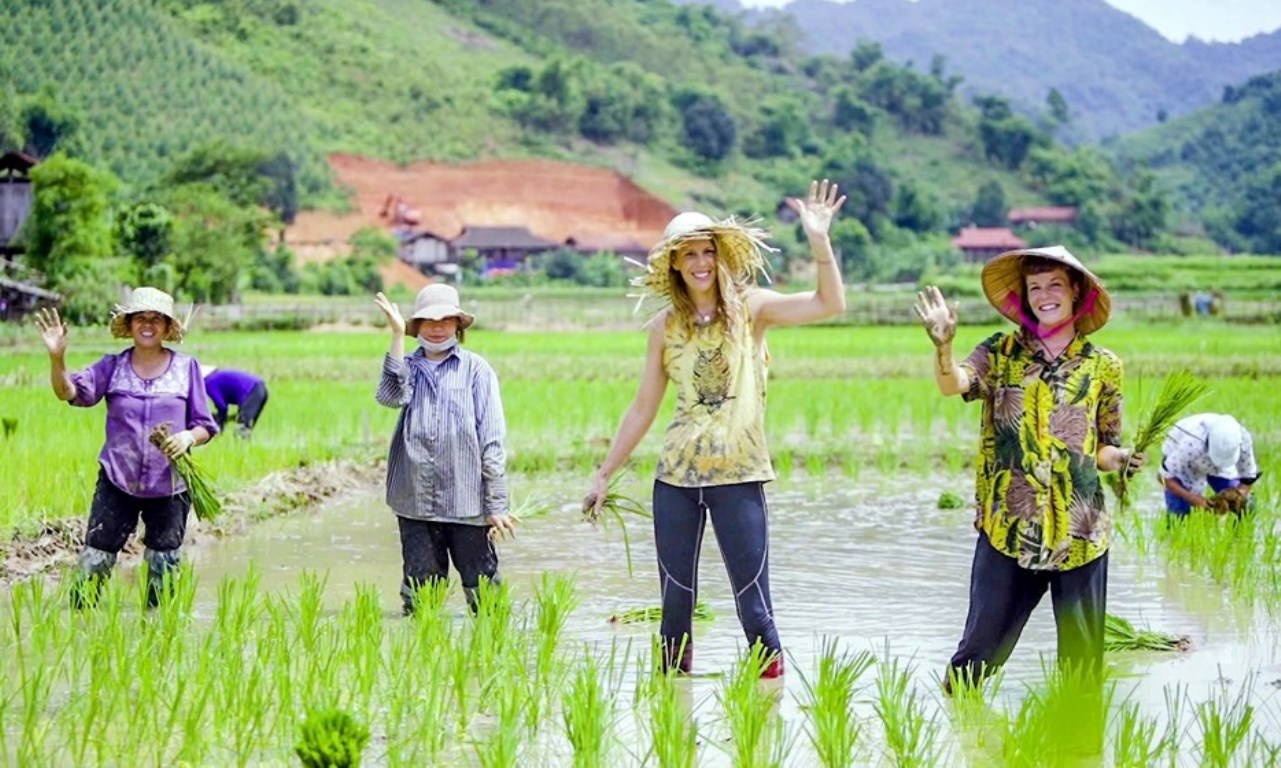 Du khách quốc tế trải nghiệm cấy lúa truyền thống