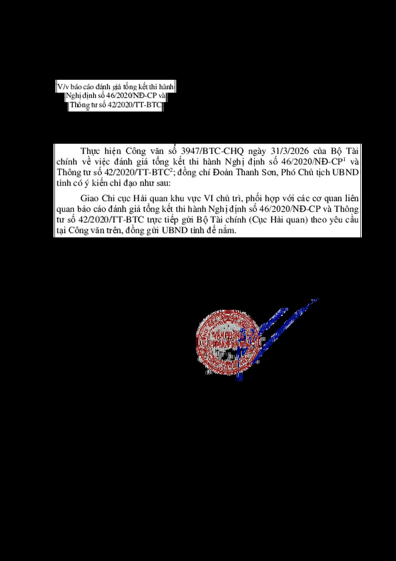 | Tiêu đề văn bản | V/v báo cáo đánh giá tổng kết thi hành Nghị định số 46/2020/NĐ-CP và Thông tư số 42/2020/TT-BTC | ||