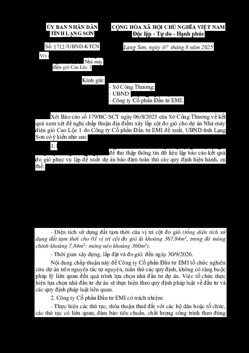 | Tiêu đề văn bản | V/v chấp thuận địa điểm xây lắp cột đo gió cho dự án Nhà máy điện gió Cao Lộc 1 | ||