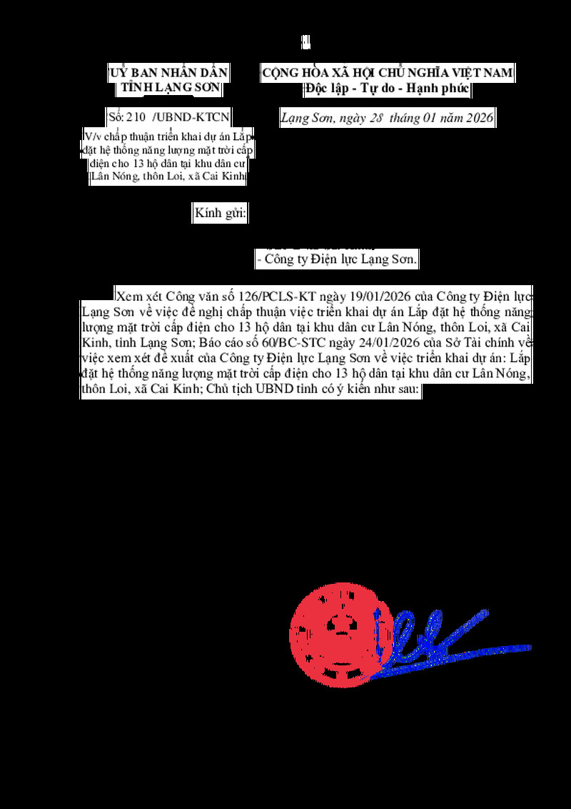 | Tiêu đề văn bản | V/v chấp thuận việc triển khai dự án: Lắp đặt hệ thống năng lượng mặt trời cấp điện cho 13 hộ dân tại khu dân cư Lân Nóng, thôn Loi, xã Cai Kinh | ||