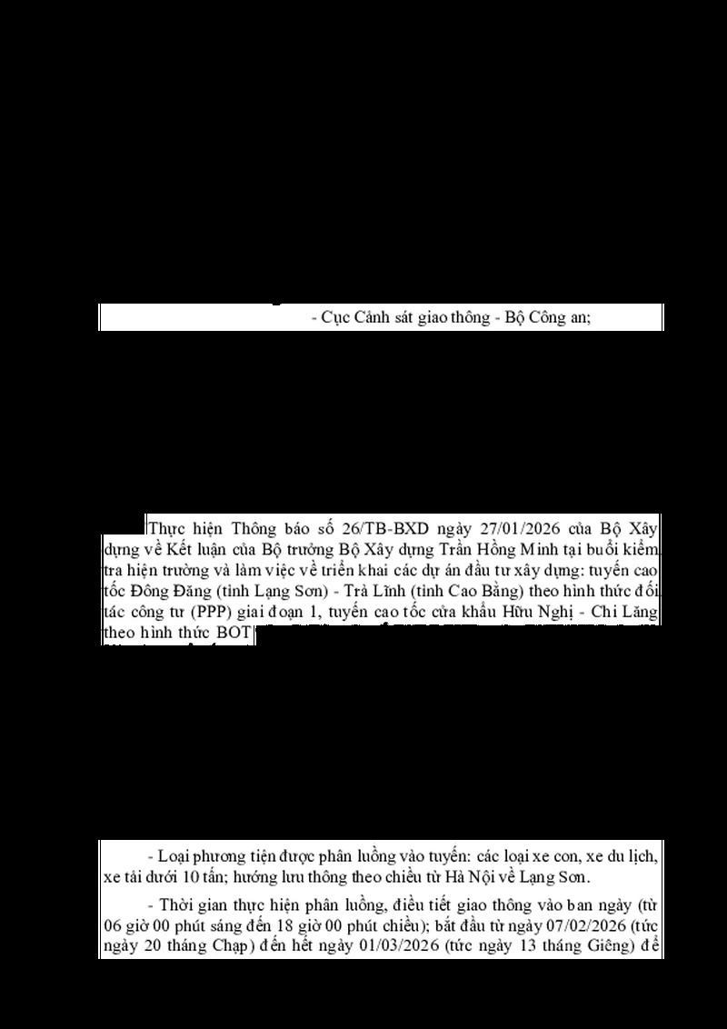 | Tiêu đề văn bản | V/v cho phép phân luồng tổ chức giao thông tạm đoạn từ Chi Lăng đến nút giao Quốc lộ 4B trên tuyến cao tốc Hữu Nghị - Chi Lăng trong dịp Tết Nguyên đán khi có ùn tắc giao thông trên đường Quốc lộ 1 | ||