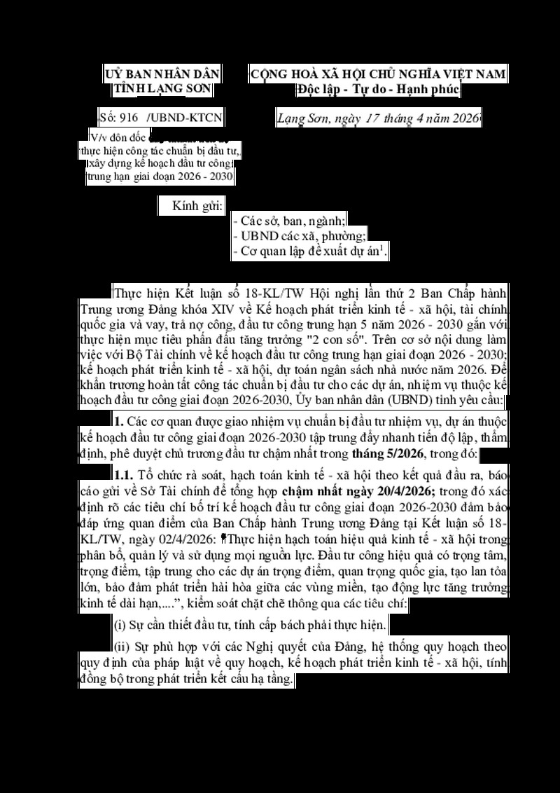 | Tiêu đề văn bản | V/v đôn đốc đẩy nhanh tiến độ thực hiện công tác chuẩn bị đầu tư, xây dựng kế hoạch đầu tư công trung hạn giai đoạn 2026 - 2030 | ||