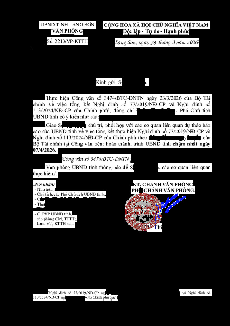 | Tiêu đề văn bản | V/v dự thảo Báo cáo tổng kết thực hiện Nghị định số 77/2019/NĐ-CP và Nghị định số 113/2024/NĐ-CP của Chính phủ | ||