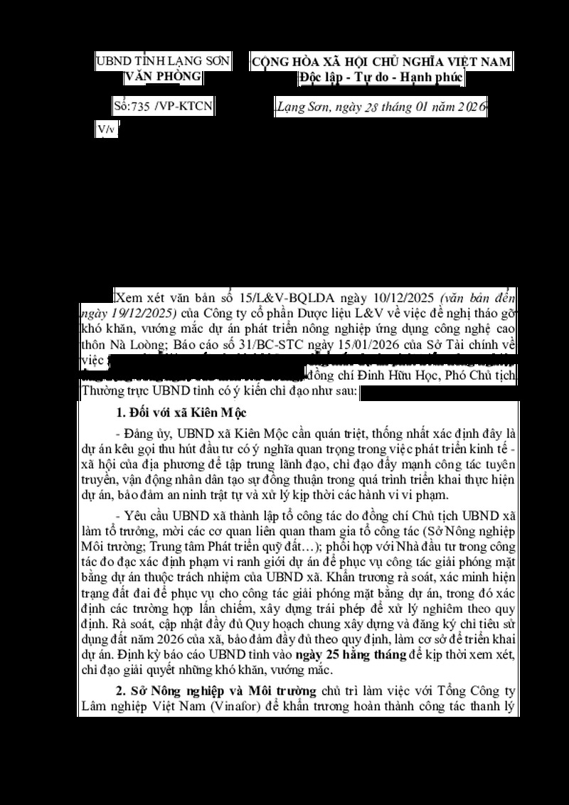 | Tiêu đề văn bản | V/v giải quyết các khó khăn, vướng mắc dự án phát triển nông nghiệp ứng dụng công nghệ cao thôn Nà Loòng | ||