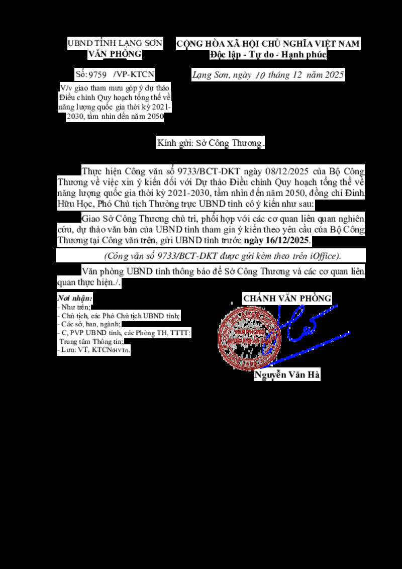 | Tiêu đề văn bản | V/v giao tham mưu góp ý dự thảo Điều chỉnh Quy hoạch tổng thể về năng lượng quốc gia thời kỳ 2021-2030, tầm nhìn đến năm 2050 | ||