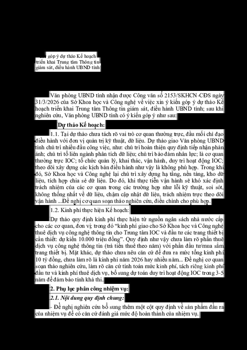 | Tiêu đề văn bản | V/v góp ý dự thảo Kế hoạch triển khai Trung tâm Thông tin giám sát, điều hành UBND tỉnh | ||
