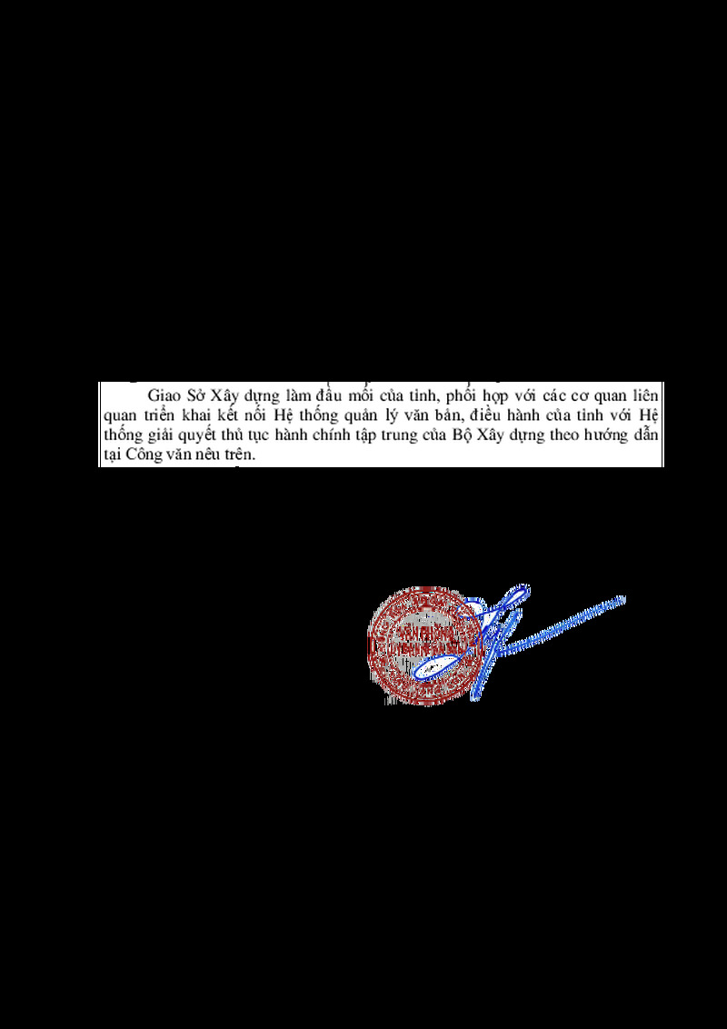 | Tiêu đề văn bản | V/v kết nối Hệ thống quản lý văn bản, điều hành của tỉnh với Hệ thống giải quyết thủ tục hành chính tập trung của Bộ Xây dựng | ||