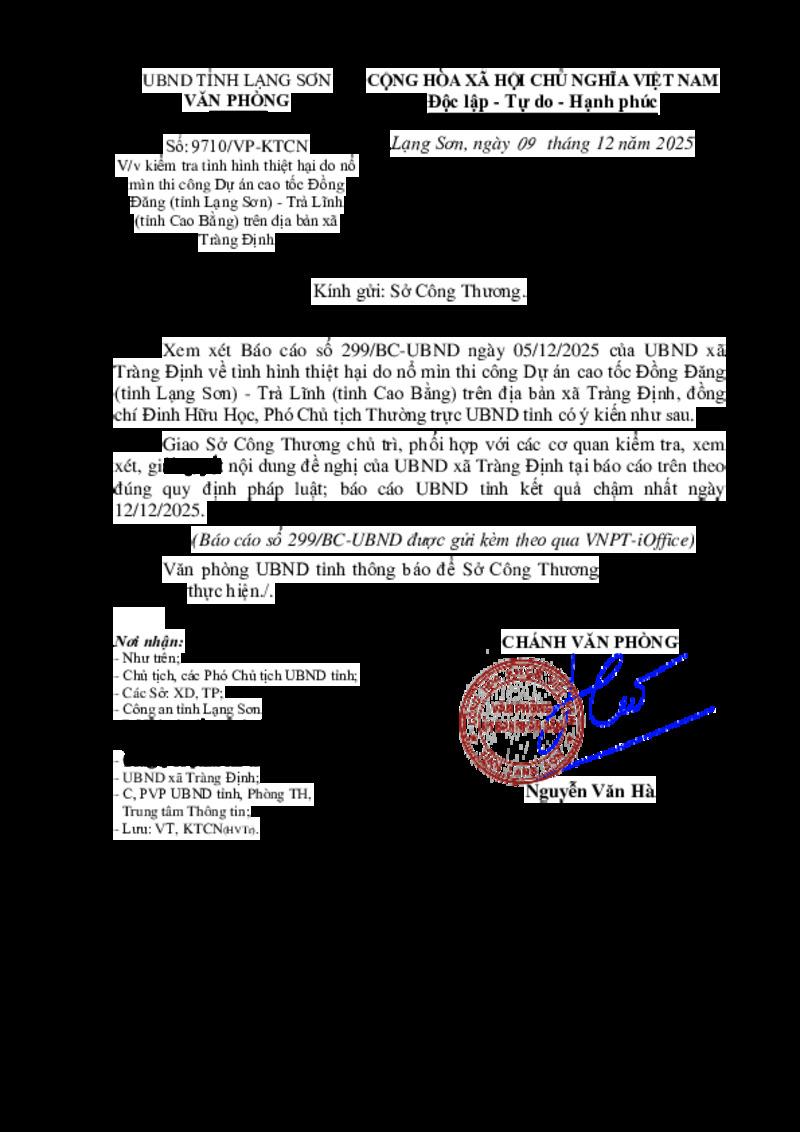 | Tiêu đề văn bản | V/v kiểm tra tình hình thiệt hại do nổ mìn thi công Dự án cao tốc Đồng Đăng (tỉnh Lạng Sơn) - Trà Lĩnh (tỉnh Cao Bằng) trên địa bàn xã Tràng Định | ||