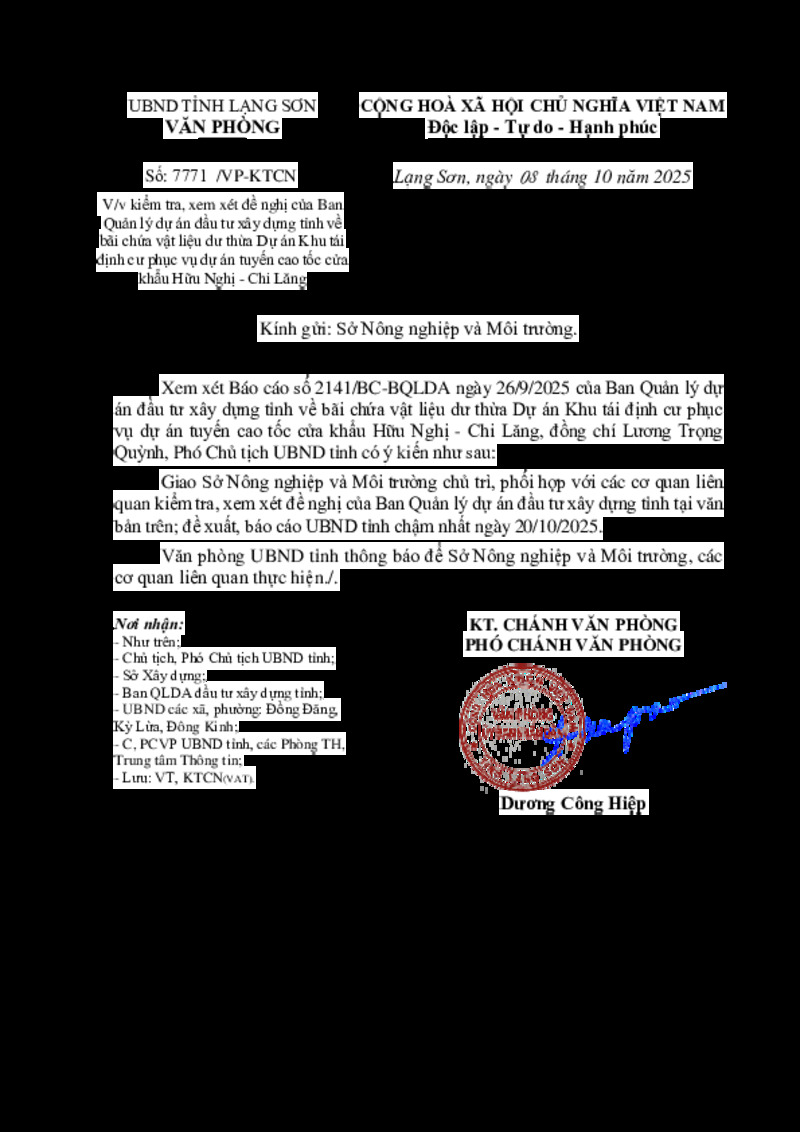 Tiêu đề văn bản | V/v kiểm tra, xem xét đề nghị của Ban Quản lý dự án đầu tư xây dựng tỉnh về bãi chứa vật liệu dư thừa Dự án Khu tái định cư phục vụ dự án tuyến cao tốc cửa khẩu Hữu Nghị - Chi Lăng | ||