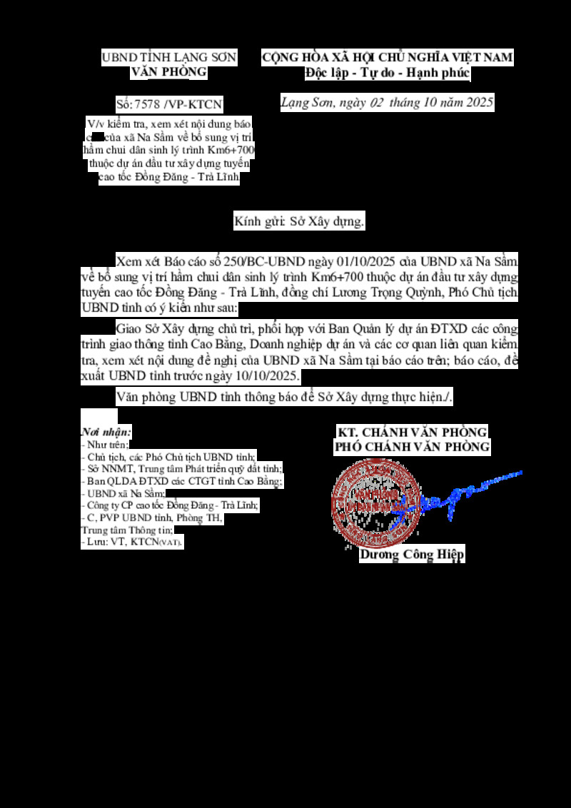Tiêu đề văn bản | V/v kiểm tra, xem xét nội dung báo của xã Na Sầm về bổ sung vị trí hầm chui dân sinh lý trình Km6+700 thuộc dự án đầu tư xây dựng tuyến cao tốc Đồng Đăng - Trà Lĩnh | ||