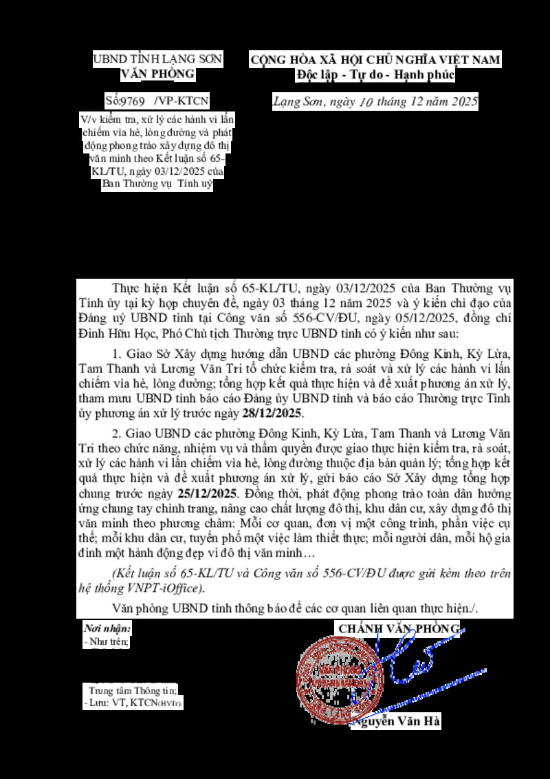 | Tiêu đề văn bản | V/v kiểm tra, xử lý các hành vi lấn chiếm vỉa hè, lòng đường và phát động phong trào xây dựng đô thị văn minh theo Kết luận số 65-KL/TU, ngày 03/12/2025 của Ban Thường vụ Tỉnh uỷ | ||