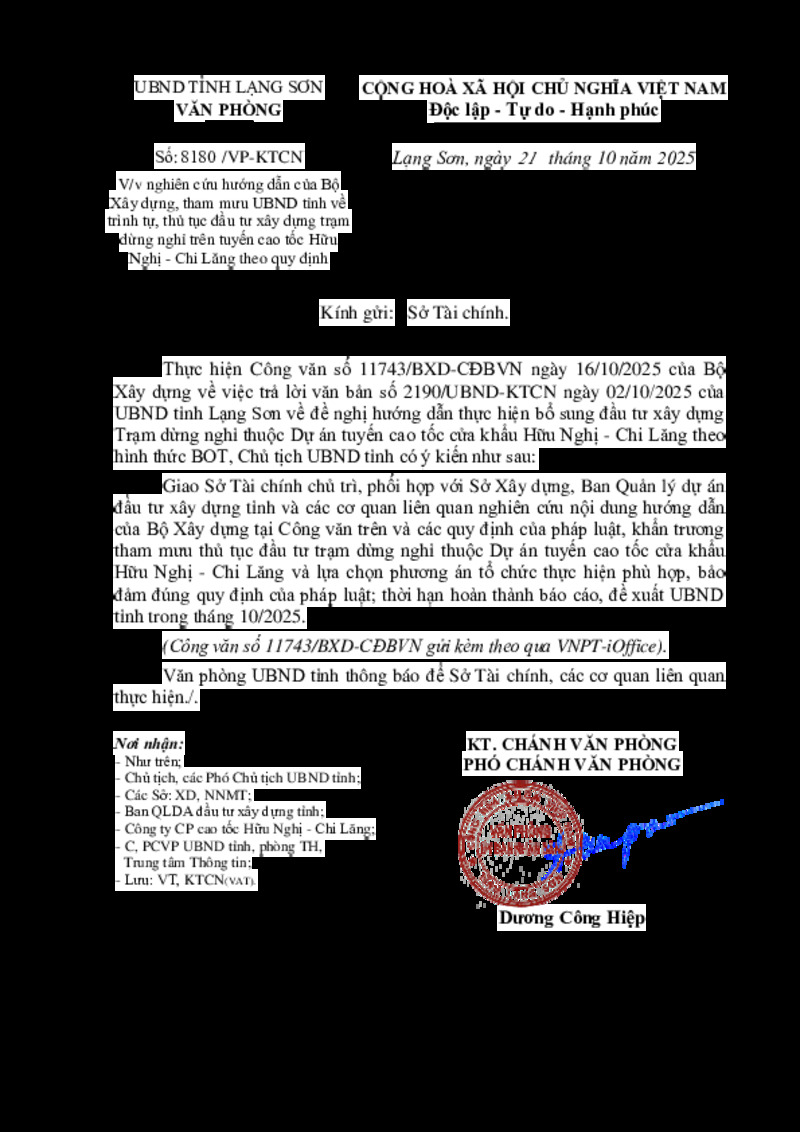 | Tiêu đề văn bản | V/v nghiên cứu hướng dẫn của Bộ Xây dựng, tham mưu UBND tỉnh về trình tự, thủ tục đầu tư xây dựng trạm dừng nghỉ trên tuyến cao tốc Hữu Nghị - Chi Lăng theo quy định | ||