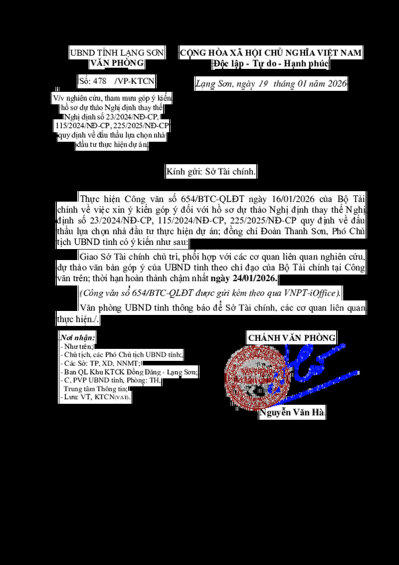 | Tiêu đề văn bản | V/v nghiên cứu, tham mưu góp ý kiến hồ sơ dự thảo Nghị định thay thế Nghị định số 23/2024/NĐ-CP, 115/2024/NĐ-CP, 225/2025/NĐ-CP quy định về đấu thầu lựa chọn nhà đầu tư thực hiện dự án | ||