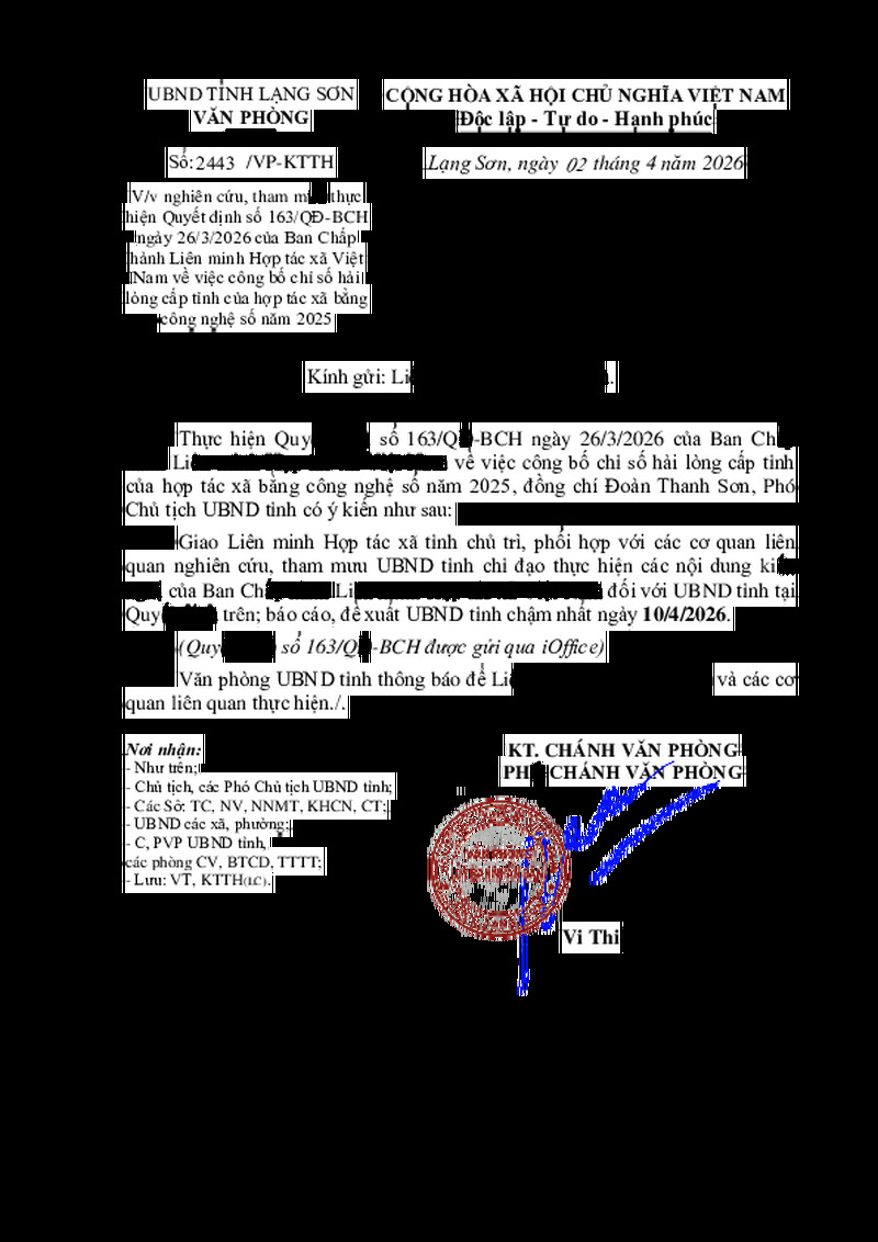 | Tiêu đề văn bản | V/v nghiên cứu, tham mưu thực hiện Quyết định số 163/QĐ-BCH ngày 26/3/2026 của Ban Chấp hành Liên minh Hợp tác xã Việt Nam về việc công bố chỉ số hài lòng cấp tỉnh của hợp tác xã bằng công nghệ số năm 2025 | ||