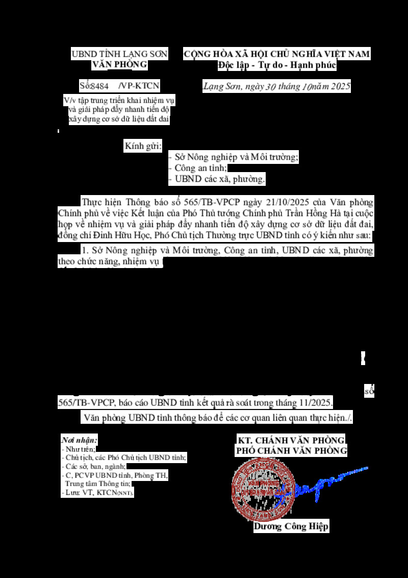 | Tiêu đề văn bản | V/v tập trung triển khai nhiệm vụ và giải pháp đẩy nhanh tiến độ xây dựng cơ sở dữ liệu đất đai | ||