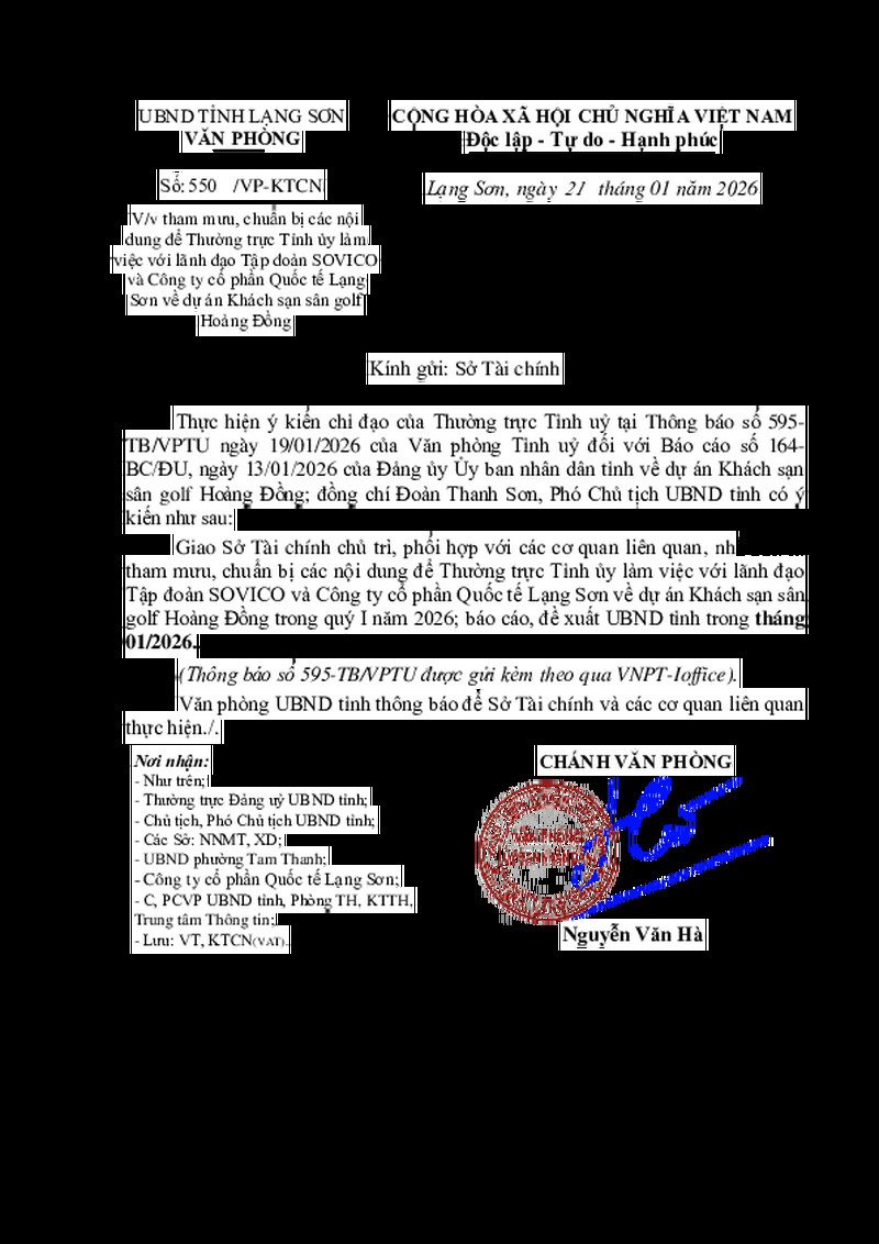 | Tiêu đề văn bản | V/v tham mưu, chuẩn bị các nội dung để Thường trực Tỉnh ủy làm việc với lãnh đạo Tập đoàn SOVICO và Công ty cổ phần Quốc tế Lạng Sơn về dự án Khách sạn sân golf Hoàng Đồng | ||