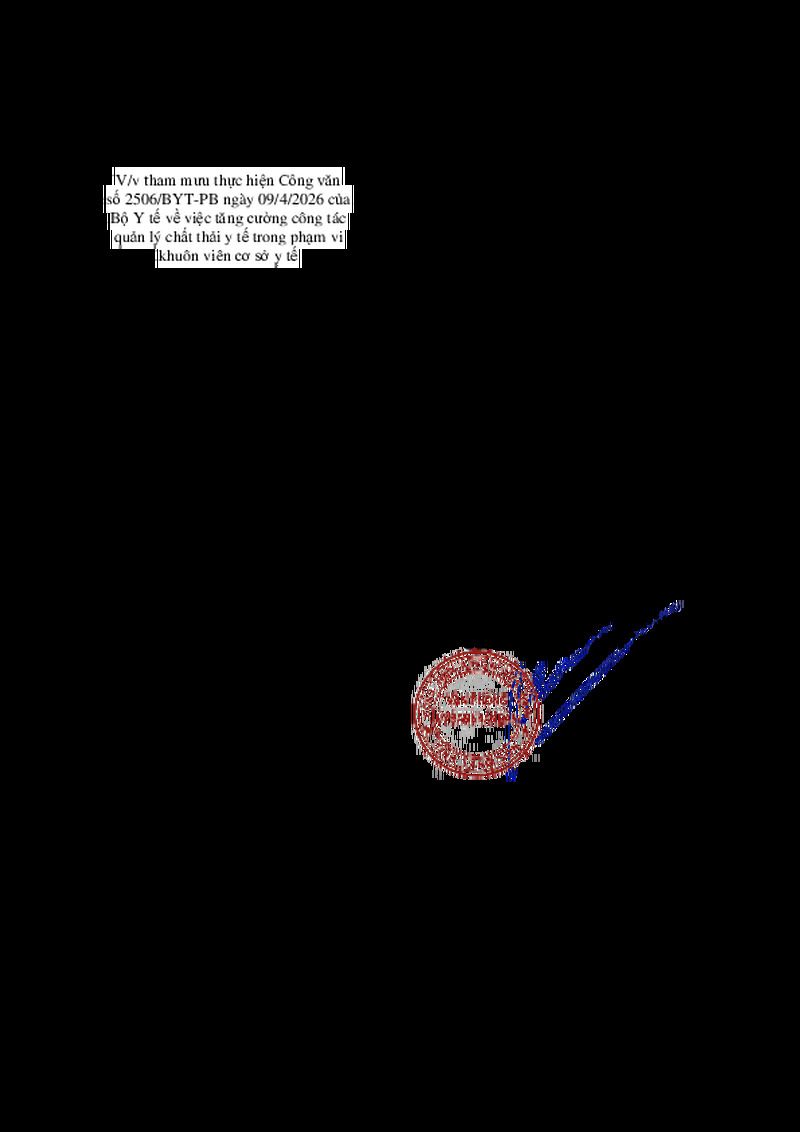 | Tiêu đề văn bản | V/v tham mưu thực hiện Công văn số 2506/BYT-PB ngày 09/4/2026 của Bộ Y tế về việc tăng cường công tác quản lý chất thải y tế trong phạm vi khuôn viên cơ sở y tế | ||