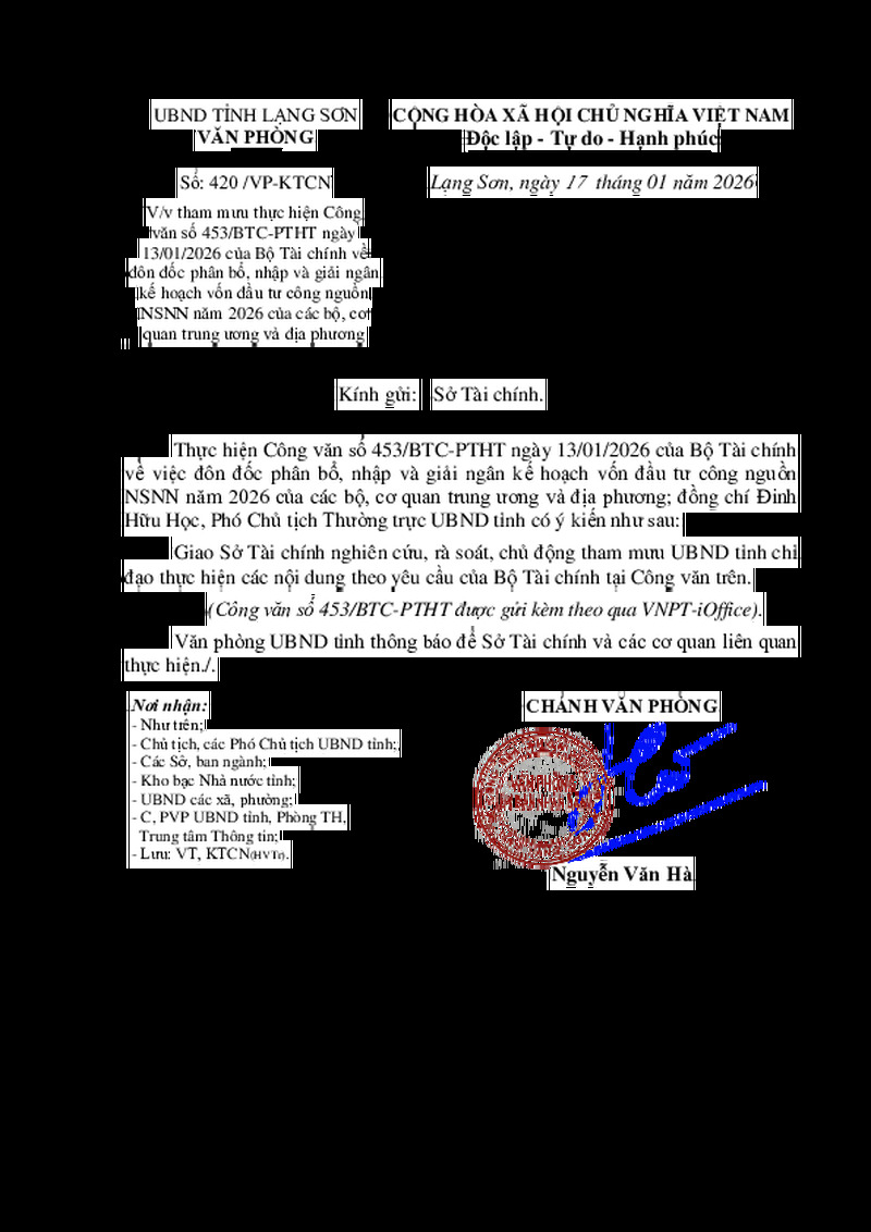 | Tiêu đề văn bản | V/v tham mưu thực hiện Công văn số 453/BTC-PTHT ngày 13/01/2026 của Bộ Tài chính về đôn đốc phân bổ, nhập và giải ngân kế hoạch vốn đầu tư công nguồn NSNN năm 2026 của các bộ, cơ quan trung ương và địa phương | ||