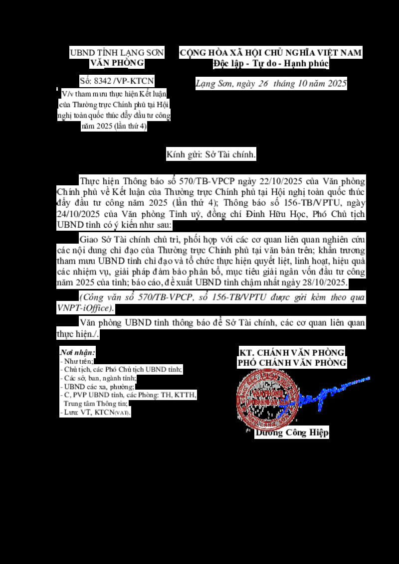 | Tiêu đề văn bản | V/v tham mưu thực hiện Kết luận của Thường trực Chính phủ tại Hội nghị toàn quốc thúc đẩy đầu tư công năm 2025 (lần thứ 4) | ||