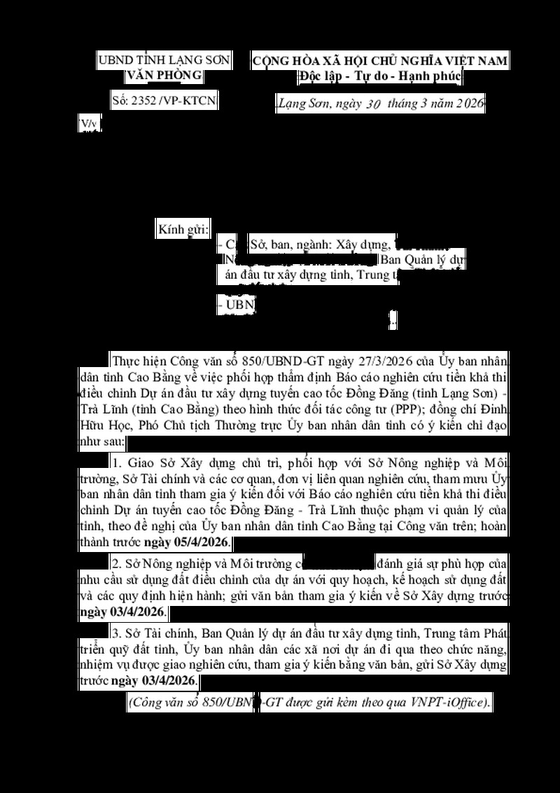 | Tiêu đề văn bản | V/v tham mưu UBND tỉnh tham gia ý kiến đối với Báo cáo nghiên cứu tiền khả thi điều chỉnh dự án đầu tư xây dựng tuyến cao tốc Đồng Đăng (tỉnh Lạng Sơn) - Trà Lĩnh (tỉnh Cao Bằng) theo hình thức đối tác công tư (PPP) | ||