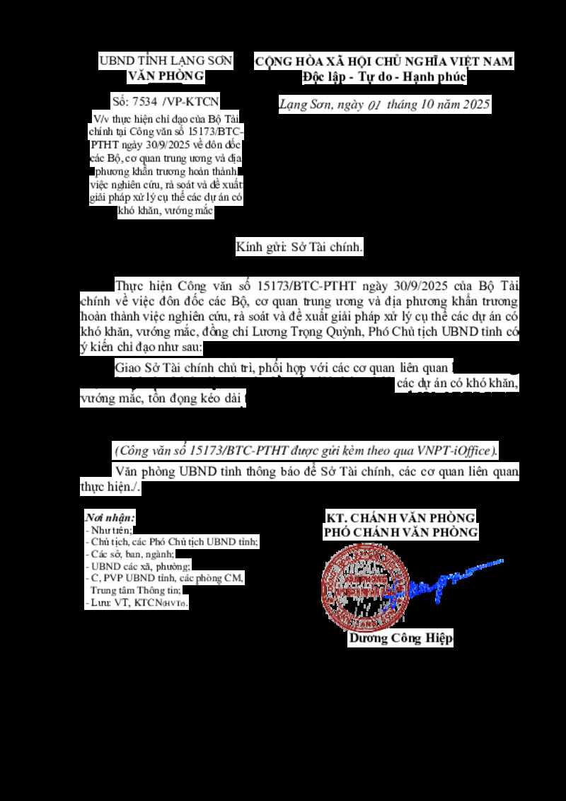 Tiêu đề văn bản | V/v thực hiện chỉ đạo của Bộ Tài chính tại Công văn số 15173/BTC-PTHT ngày 30/9/2025 về đôn đốc các Bộ, cơ quan trung ương và địa phương khẩn trương hoàn thành việc nghiên cứu, rà soát và đề xuất giải pháp xử lý cụ thể các dự án có khó khăn, vướng mắc | ||