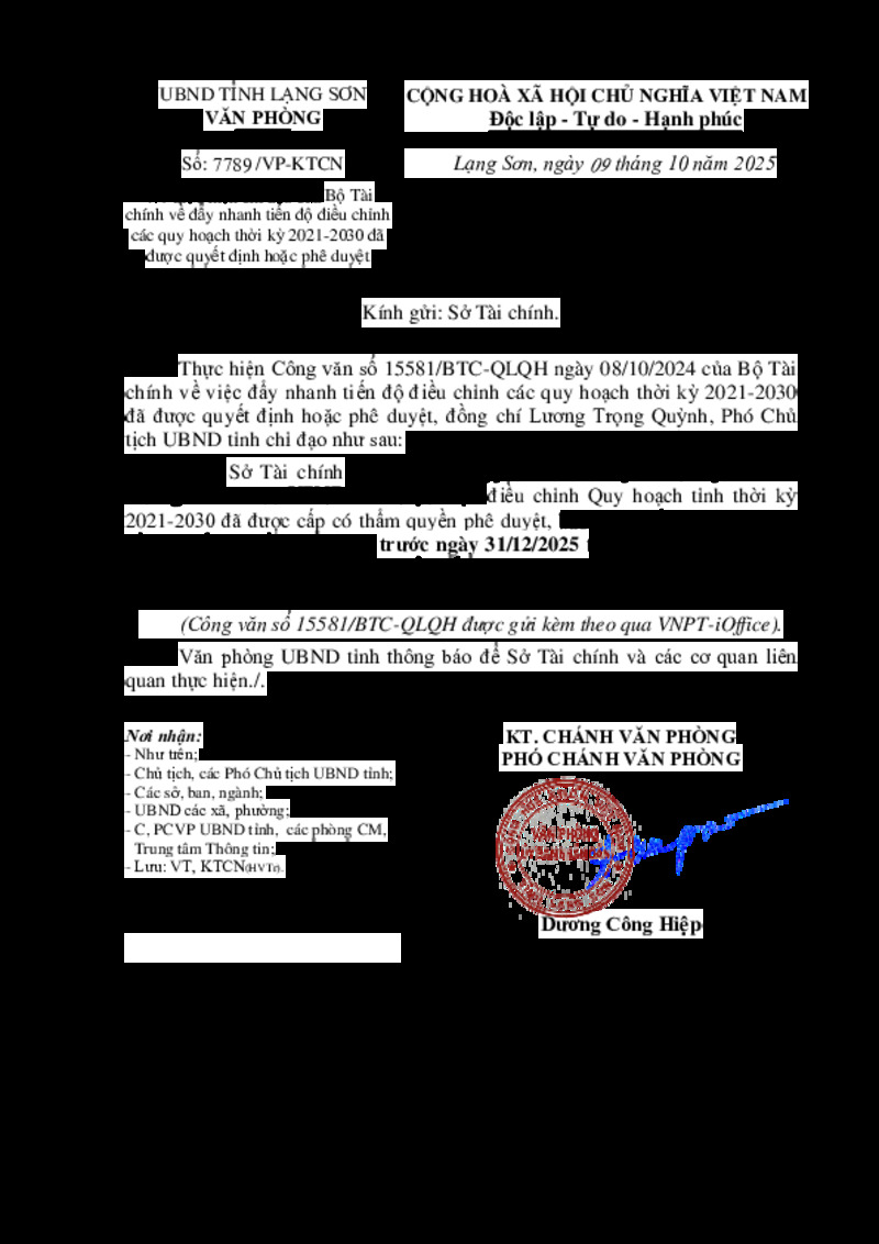 Tiêu đề văn bản | V/v thực hiện chỉ đạo của Bộ Tài chính về đẩy nhanh tiến độ điều chỉnh các quy hoạch thời kỳ 2021-2030 đã được quyết định hoặc phê duyệt | ||