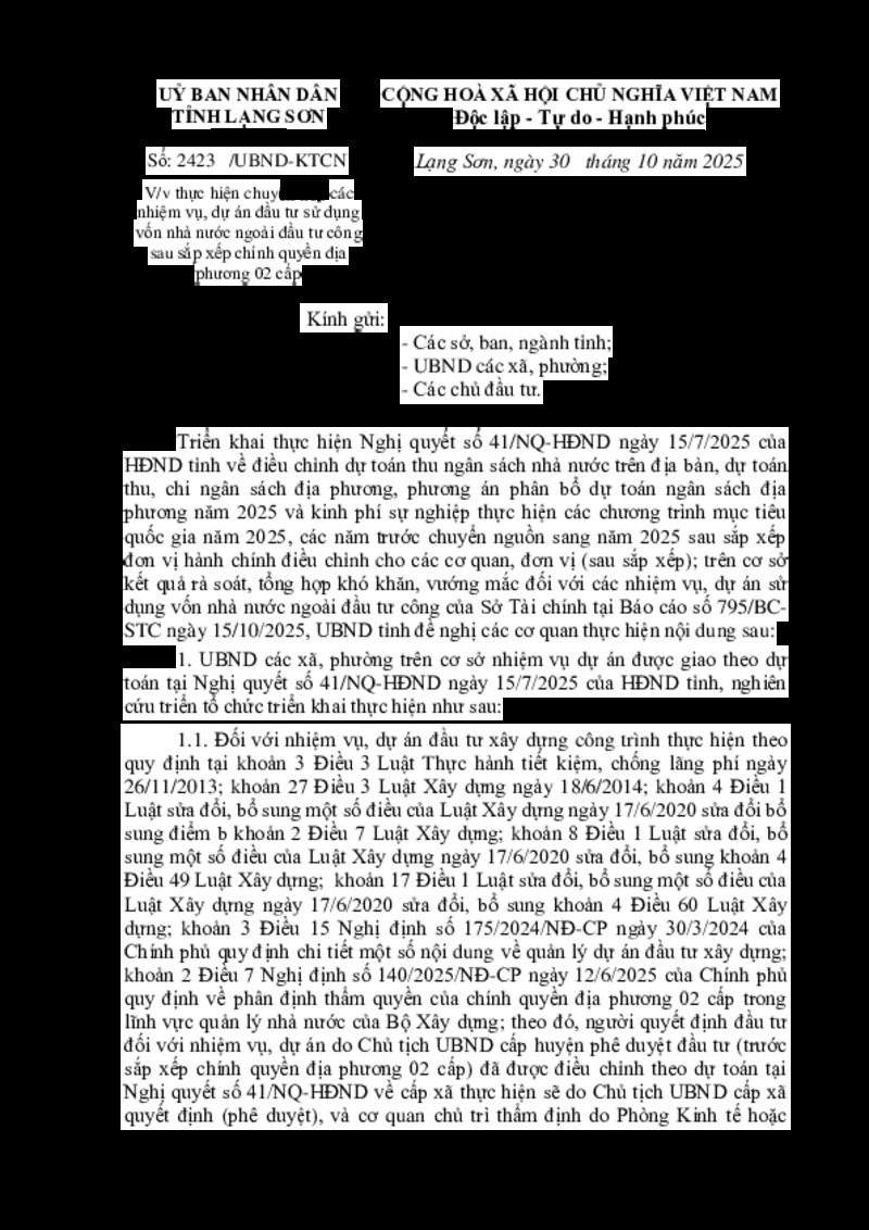 | Tiêu đề văn bản | V/v thực hiện chuyển tiếp các nhiệm vụ, dự án đầu tư sử dụng vốn nhà nước ngoài đầu tư công sau sắp xếp chính quyền địa phương 02 cấp | ||