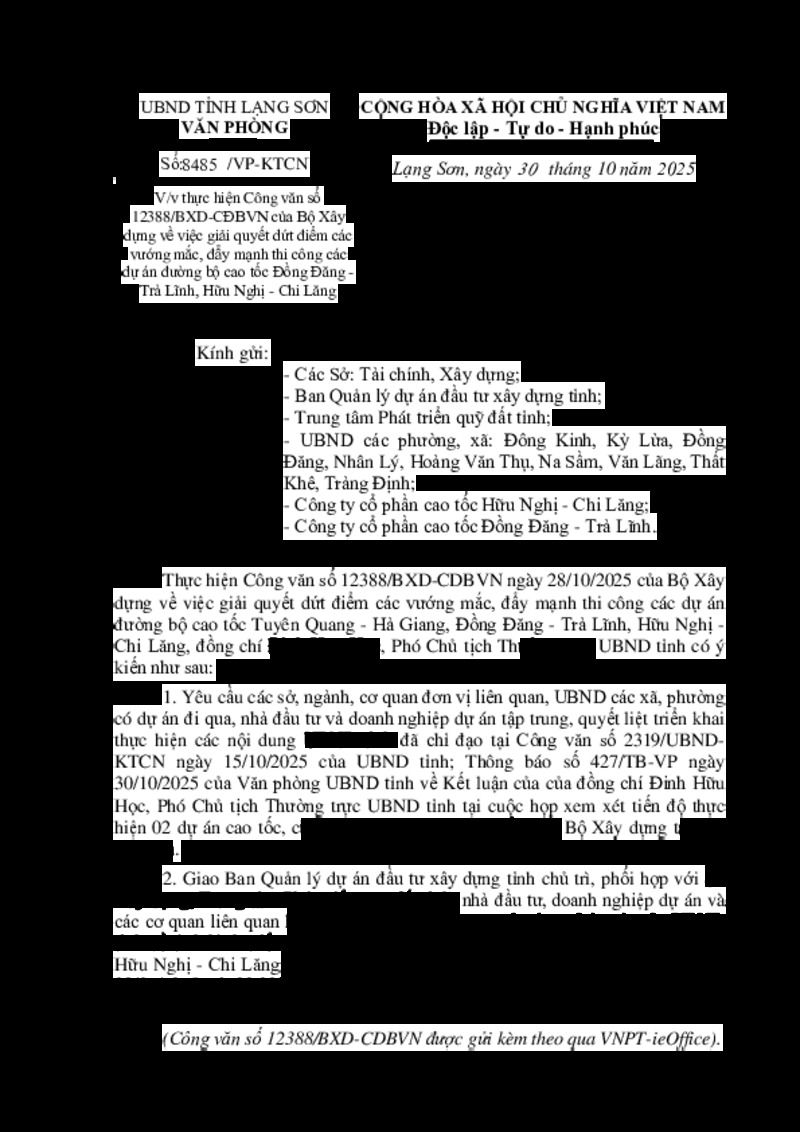 | Tiêu đề văn bản | V/v thực hiện Công văn số 12388/BXD-CĐBVN của Bộ Xây dựng về việc giải quyết dứt điểm các vướng mắc, đẩy mạnh thi công các dự án đường bộ cao tốc Đồng Đăng - Trà Lĩnh, Hữu Nghị - Chi Lăng | ||