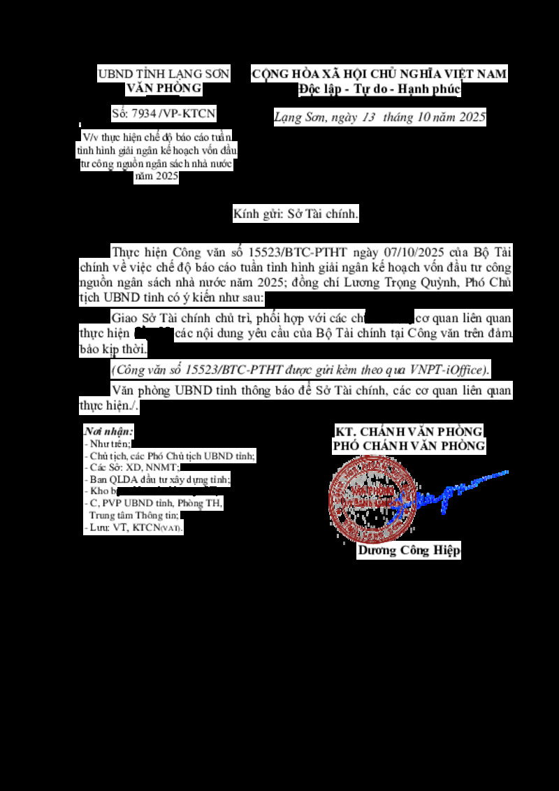 Tiêu đề văn bản | V/v thực hiện yêu cầu của Bộ Tài chính về chế độ báo cáo tuần tình hình giải ngân kế hoạch vốn đầu tư công nguồn ngân sách nhà nước năm 2025 | ||