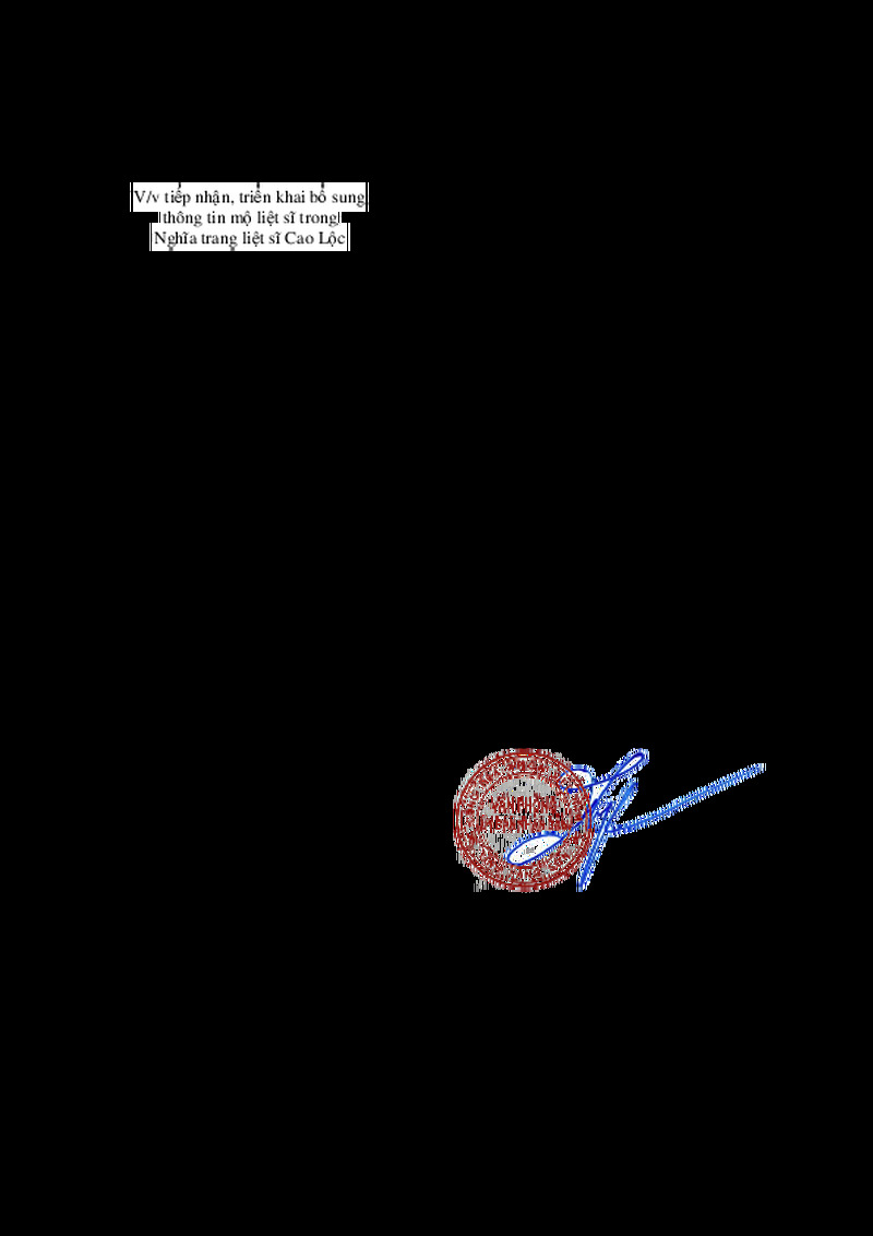 | Tiêu đề văn bản | V/v tiếp nhận, triển khai bổ sung thông tin mộ liệt sĩ trong Nghĩa trang liệt sĩ Cao Lộc | ||