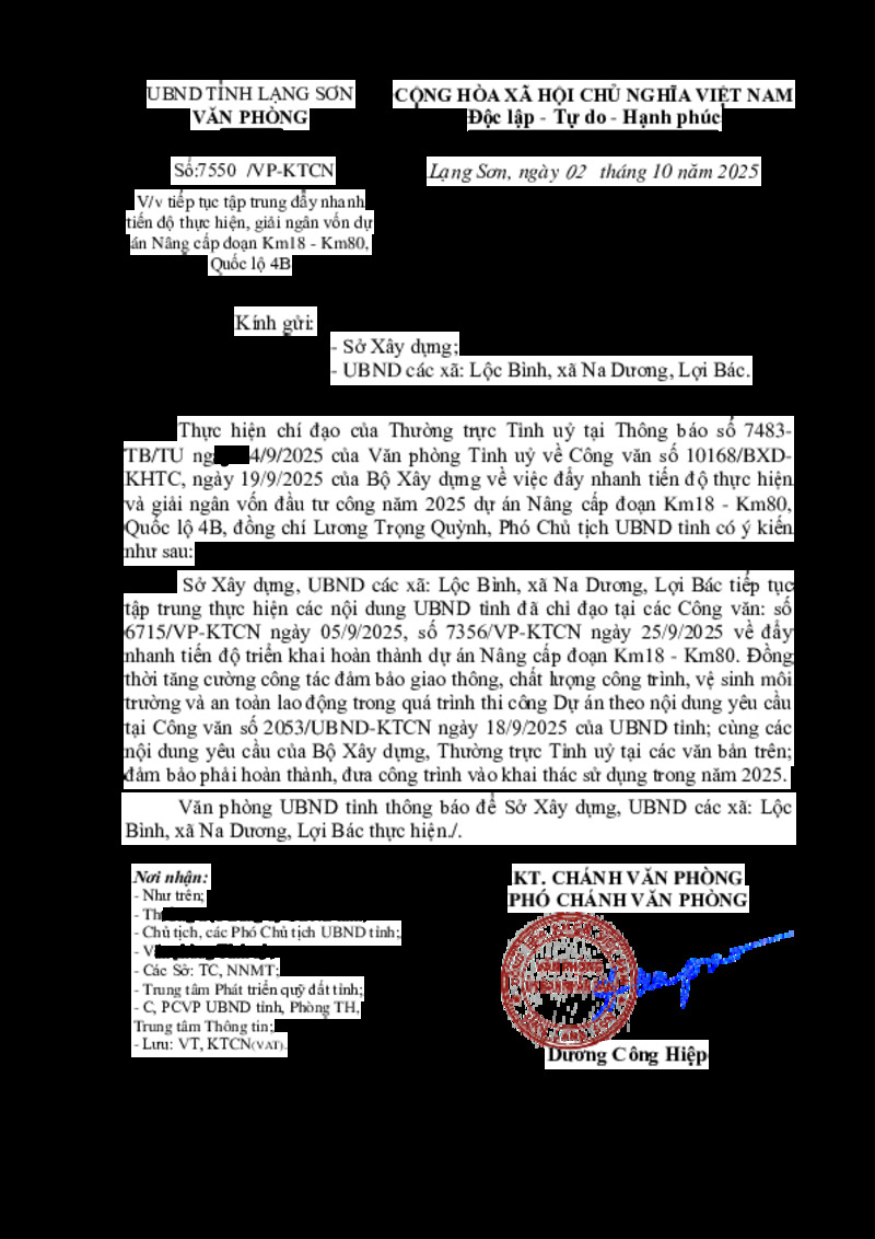 Tiêu đề văn bản | V/v tiếp tục tập trung đẩy nhanh tiến độ thực hiện, giải ngân vốn dự án Nâng cấp đoạn Km18 - Km80, Quốc lộ 4B | ||