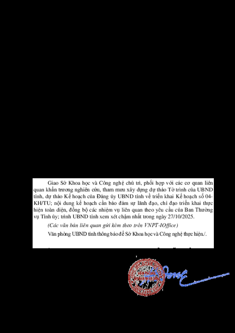 | Tiêu đề văn bản | V/v triển khai Kế hoạch số 04-KH/TU, ngày 23/10/2025 của Ban Thường vụ Tỉnh ủy về Triển khai thực hiện Thông báo kết luận của đồng chí Tổng Bí thư Tô Lâm, Trưởng Ban Chỉ đạo Trung ương về phát triển khoa học, công nghệ, đổi mới sáng tạo và chuyển đổi số | ||