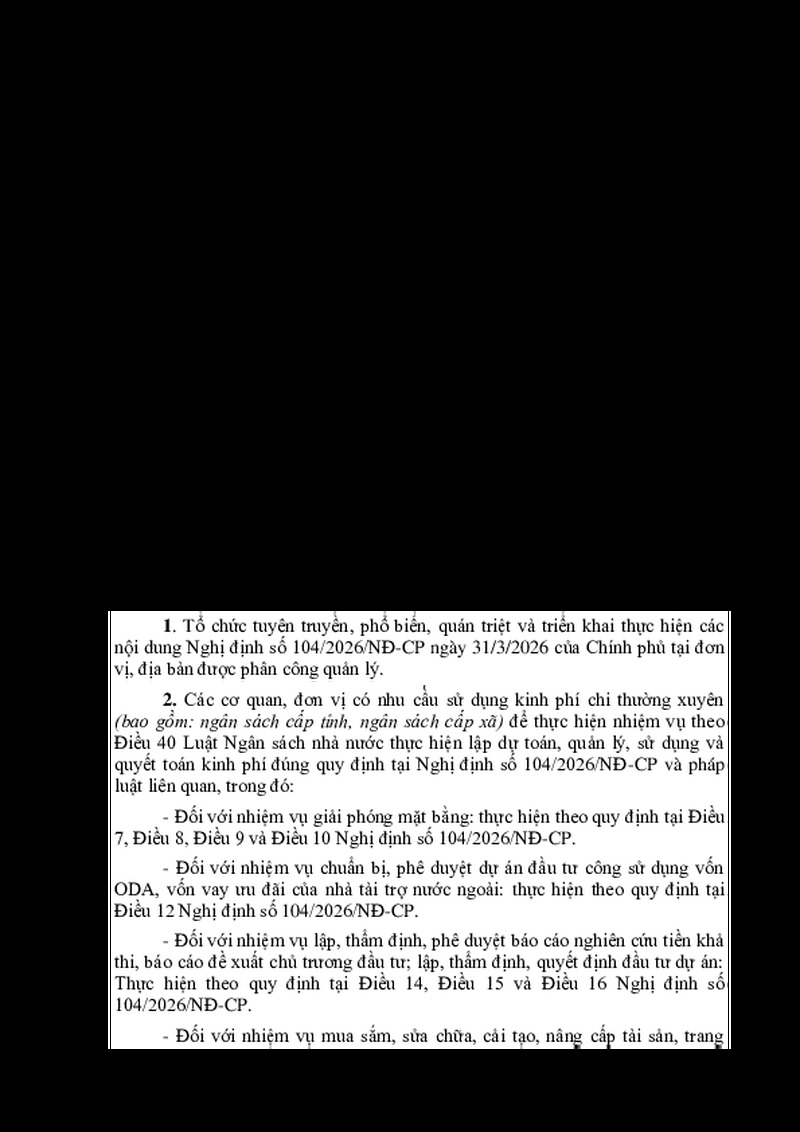 | Tiêu đề văn bản | V/v triển khai thực hiện Nghị định số 104/2026/NĐ-CP quy định việc lập dự toán, quản lý, sử dụng và quyết toán chi thường xuyên để thực hiện các nhiệm vụ quy định tại Điều 40 Luật Ngân sách nhà nước | ||