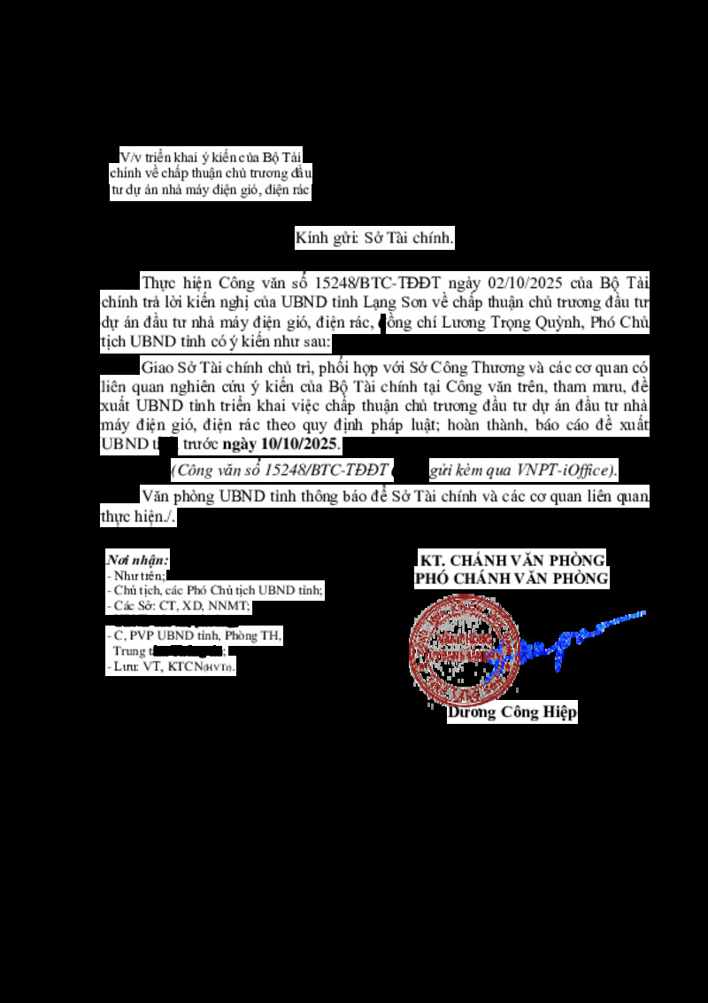 Tiêu đề văn bản | V/v triển khai ý kiến của Bộ Tài chính về chấp thuận chủ trương đầu tư dự án nhà máy điện gió, điện rác | ||