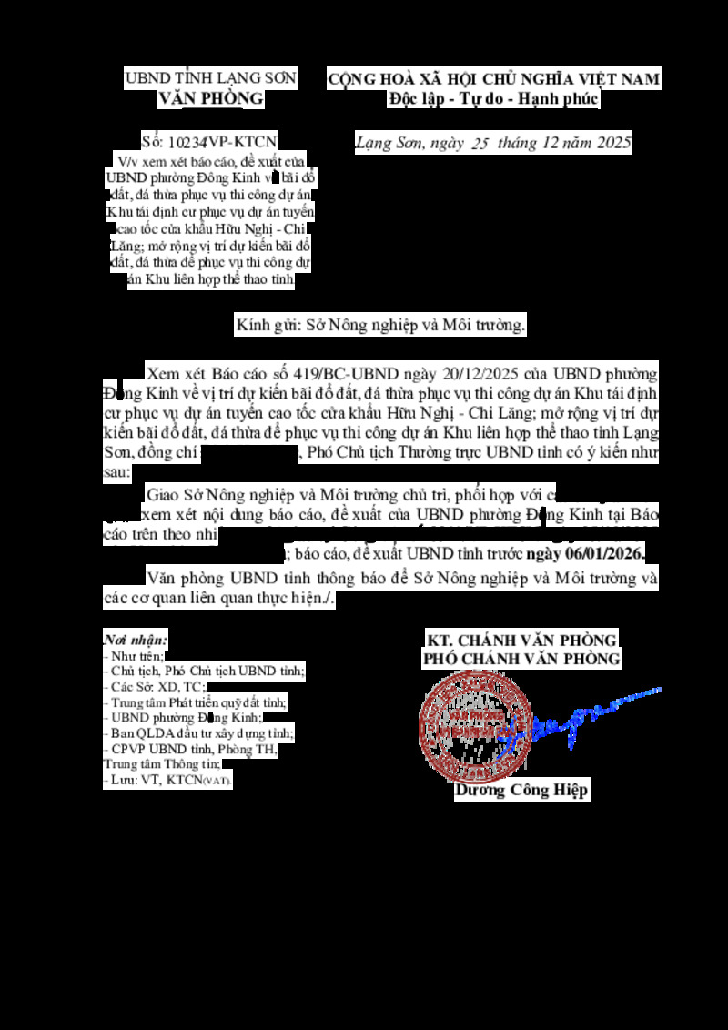 | Tiêu đề văn bản | V/v xem xét báo cáo, đề xuất của UBND phường Đông Kinh về bãi đổ đất, đá thừa phục vụ thi công dự án Khu tái định cư phục vụ dự án tuyến cao tốc cửa khẩu Hữu Nghị - Chi Lăng; mở rộng vị trí dự kiến bãi đổ đất, đá thừa để phục vụ thi công dự án Khu liên hợp thể thao tỉnh | ||