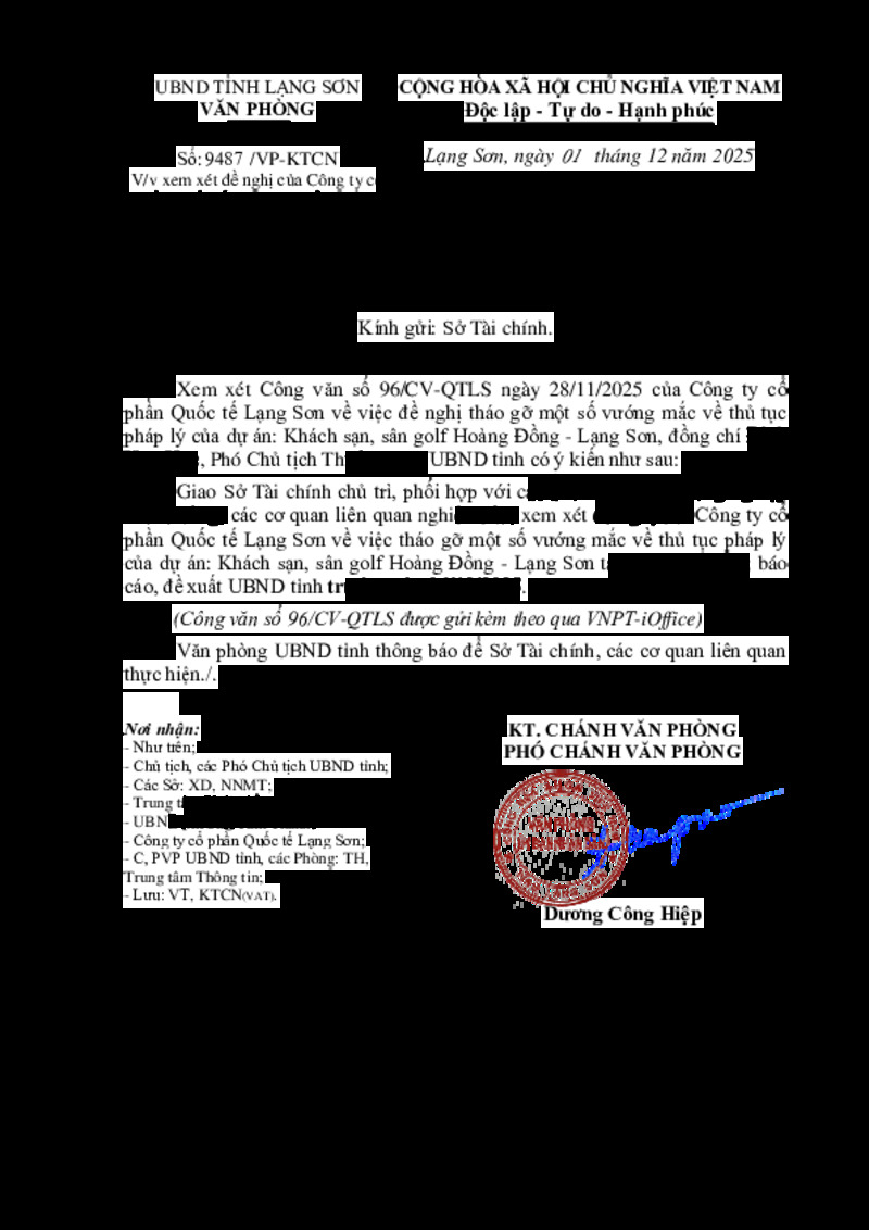 | Tiêu đề văn bản | V/v xem xét đề nghị của Công ty cổ phần Quốc tế Lạng Sơn về tháo gỡ vướng mắc thủ tục pháp lý của dự án Khách sạn, sân golf Hoàng Đồng - Lạng Sơn | ||