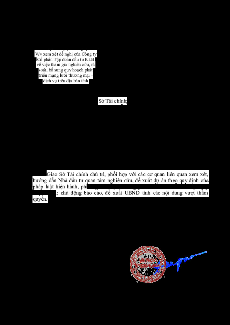 | Tiêu đề văn bản | V/v xem xét đề nghị của Công ty Cổ phần Tập đoàn đầu tư KLB về việc tham gia nghiên cứu, rà soát, bổ sung quy hoạch phát triển mạng lưới thương mại - dịch vụ trên địa bàn tỉnh | ||