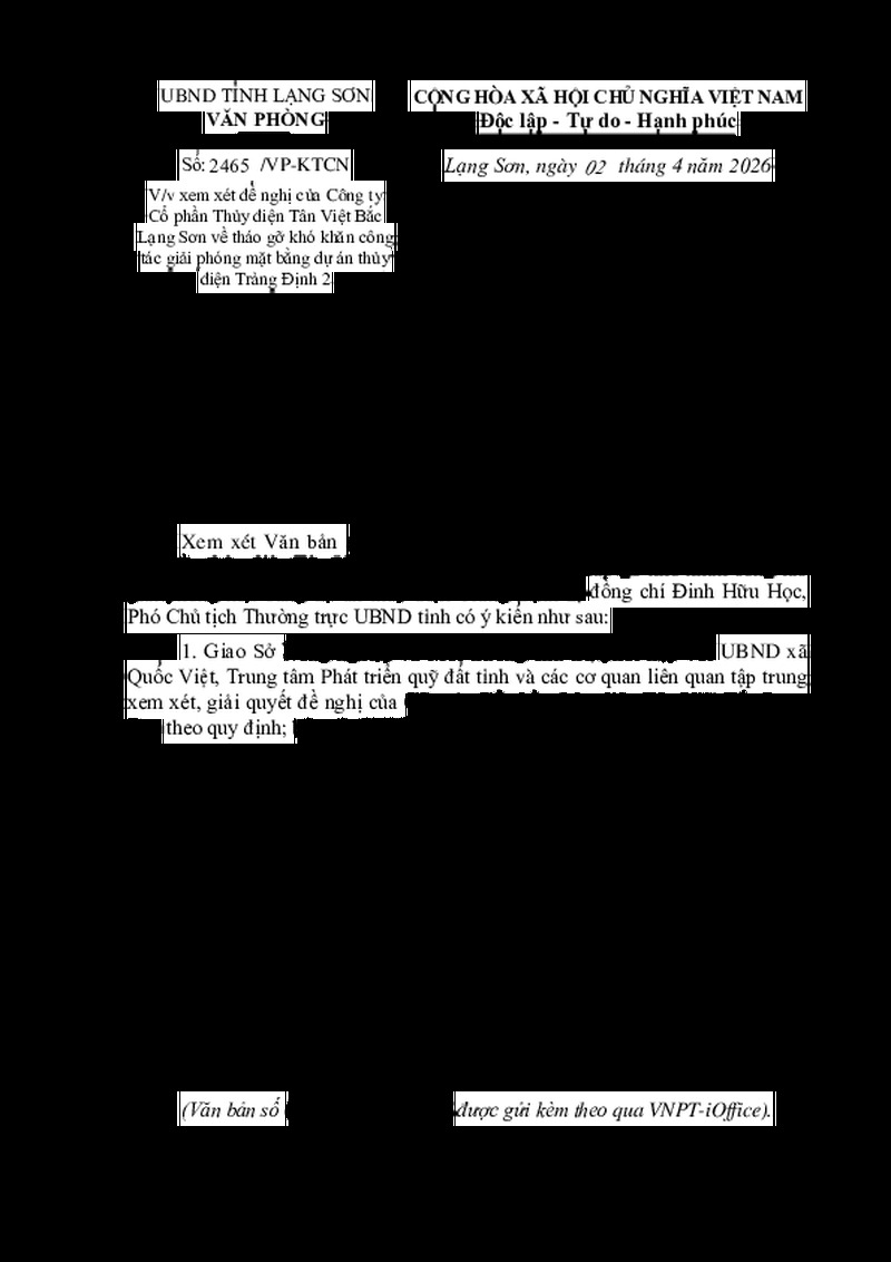 | Tiêu đề văn bản | V/v xem xét đề nghị của Công ty Cổ phần thủy điện Tân Việt Bắc Lạng Sơn về tháo gỡ khó khăn công tác giải phóng mặt bằng dự án thủy điện Tràng Định 2 | ||