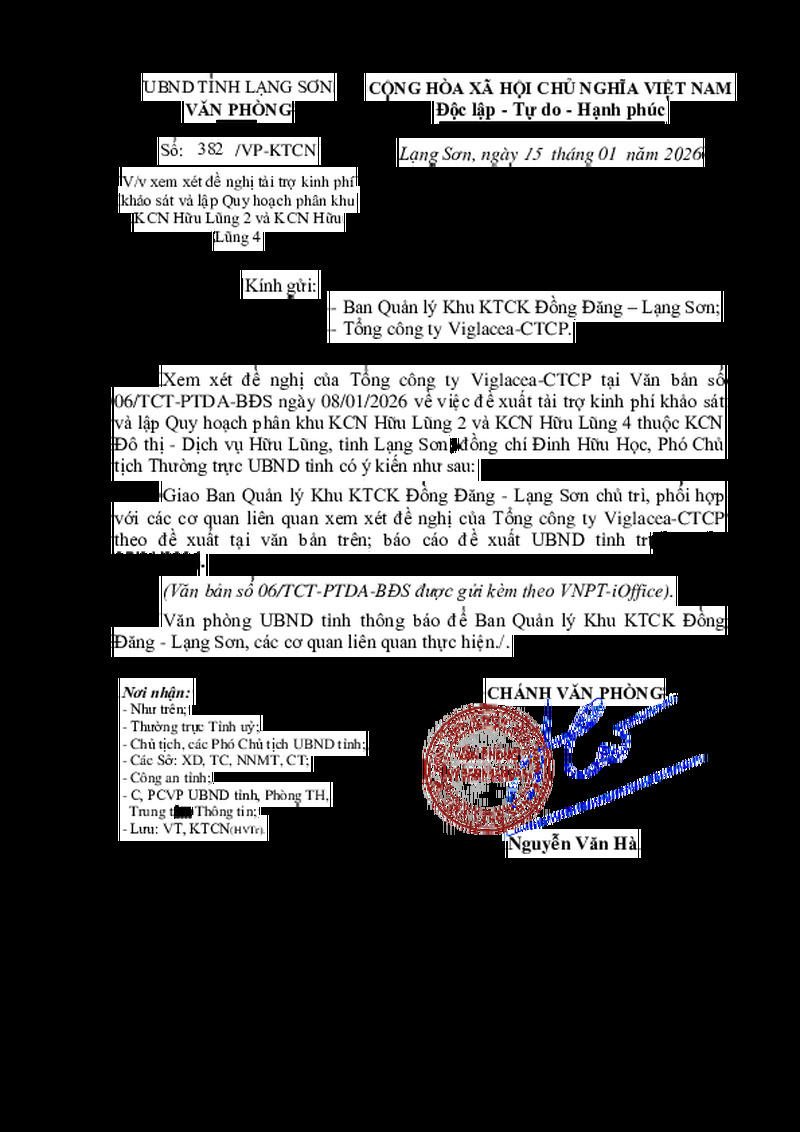 | Tiêu đề văn bản | V/v xem xét đề nghị tài trợ kinh phí khảo sát và lập Quy hoạch phân khu KCN Hữu Lũng 2 và KCN Hữu Lũng 4 | ||